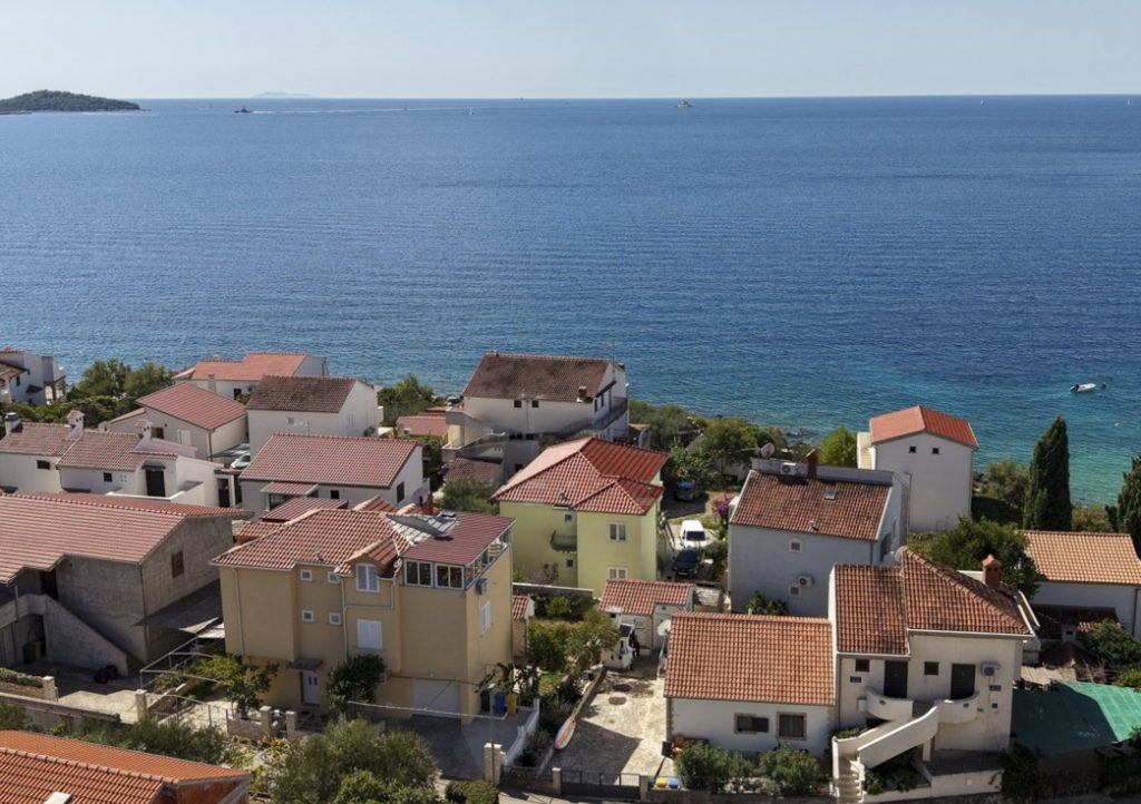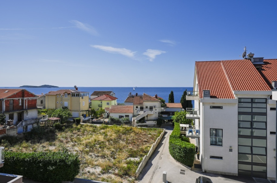 Die Außenanlage wird begrünt und mit Sichtschutz sowie Grillbereich gestaltet. Ruhige Lage mit kristallklarem Meer, Restaurant ca. 30 m, Zentrum Rogoznica ca. 1,8 km.
