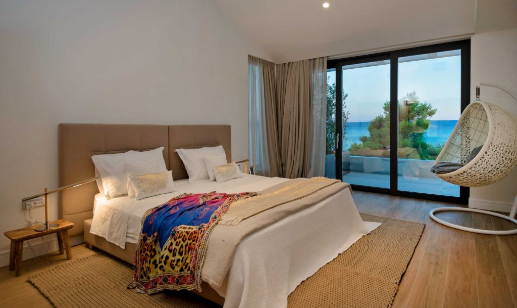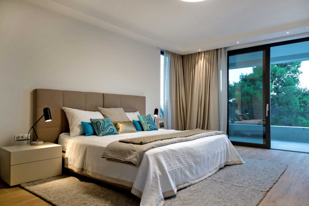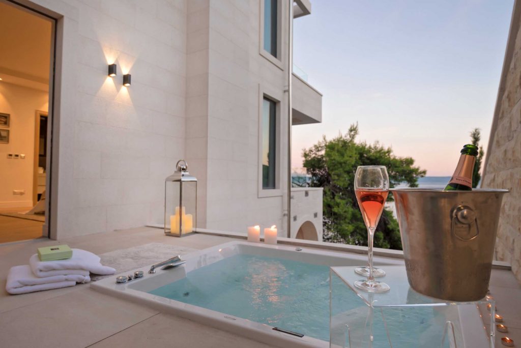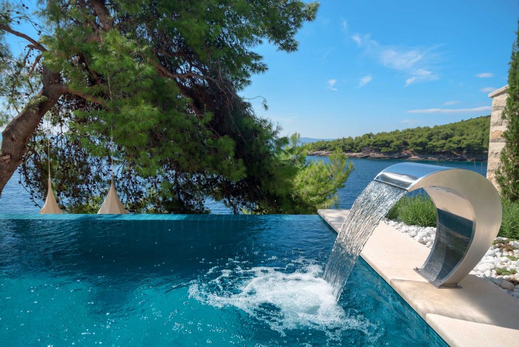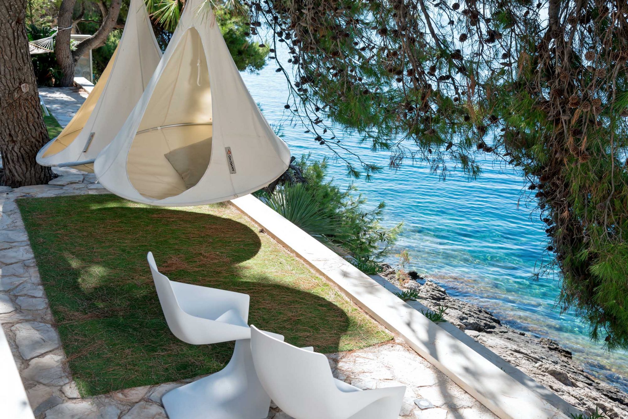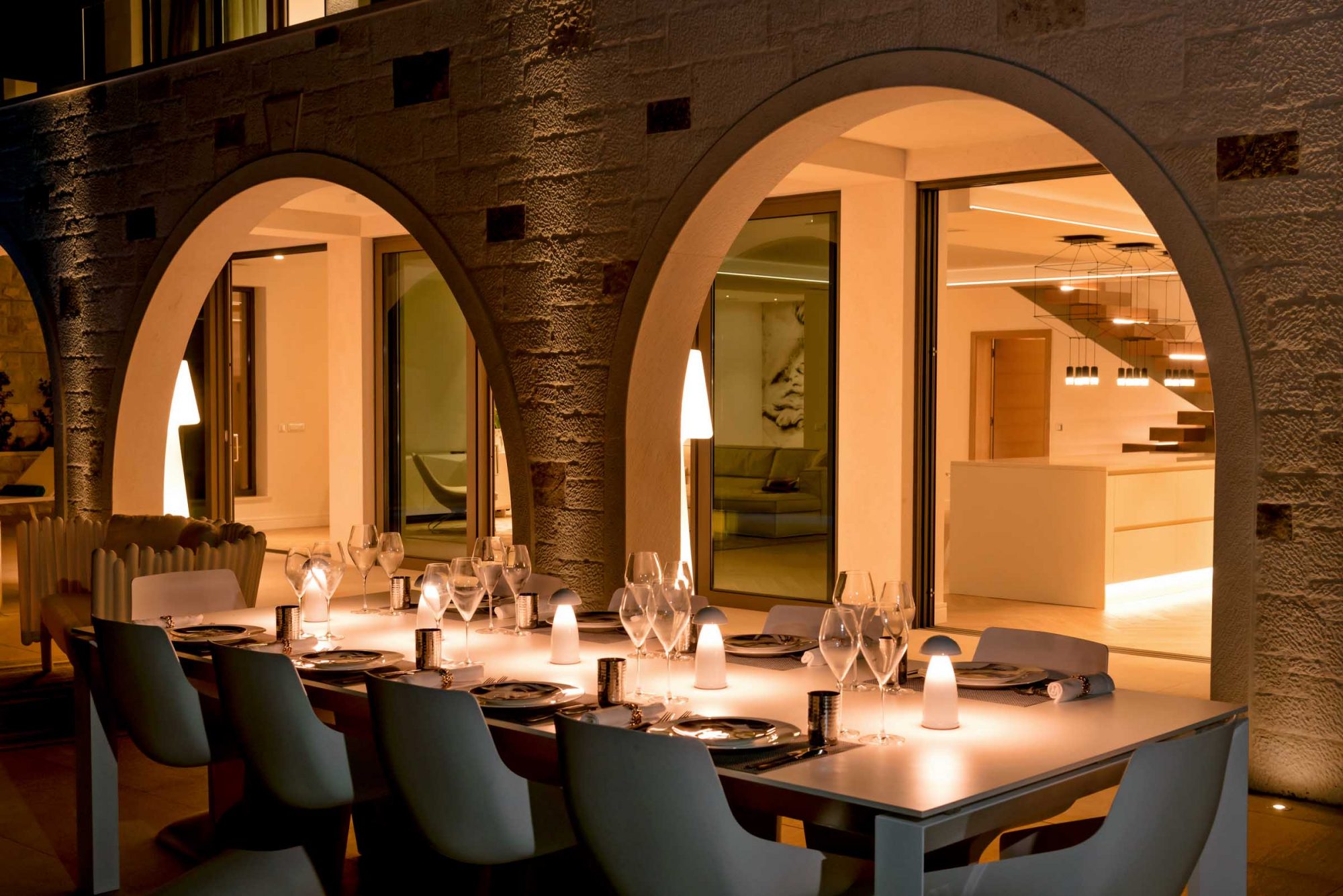 Der Wohnbereich öffnet sich fließend zur überdachten Terrasse und verbindet Innen- und Außenraum auf natürliche Weise. Im Mittelpunkt des Außenbereichs stehen der Infinity-Pool mit Blick auf die Adria, ein Whirlpool sowie ein mediterran gestalteter Garten mit Lavendel, Pinien und Palmen. Ergänzt wird das Gesamtbild durch eine Infrarotsauna, einen Fitnessbereich, einen Medienraum sowie einen privaten Bootsanlegeplatz – ideal für ein Leben am Wasser.