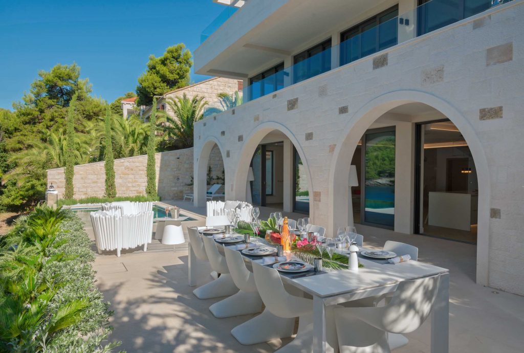 Auf einem rund 560 m² großen Grundstück erstreckt sich die aus dem charakteristischen weißen Bračer Stein gefertigte Villa mit etwa 350 m² Wohnfläche. Fünf großzügige Schlafzimmer mit Meerblick sowie elegant gestaltete Bäder bieten ein durchdachtes Raumkonzept auf zwei Ebenen. Hochwertige Materialien, individuell gefertigte Betten, eine moderne Küche mit Miele-Geräten sowie ein integriertes Soundsystem von Sonos und Bose unterstreichen den gehobenen Anspruch dieser Immobilie.