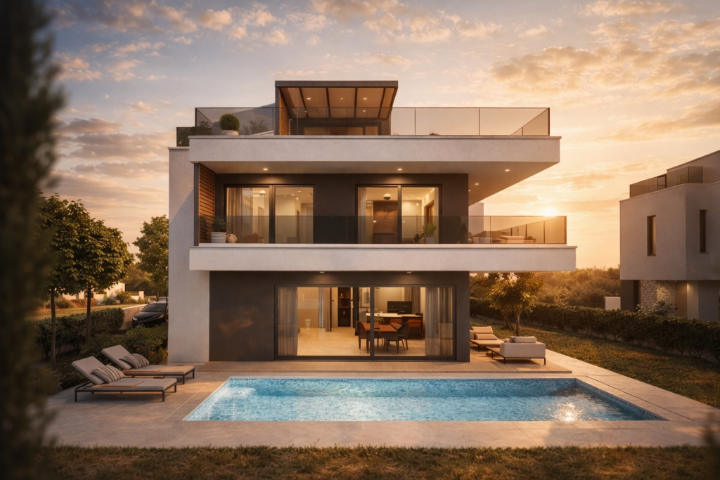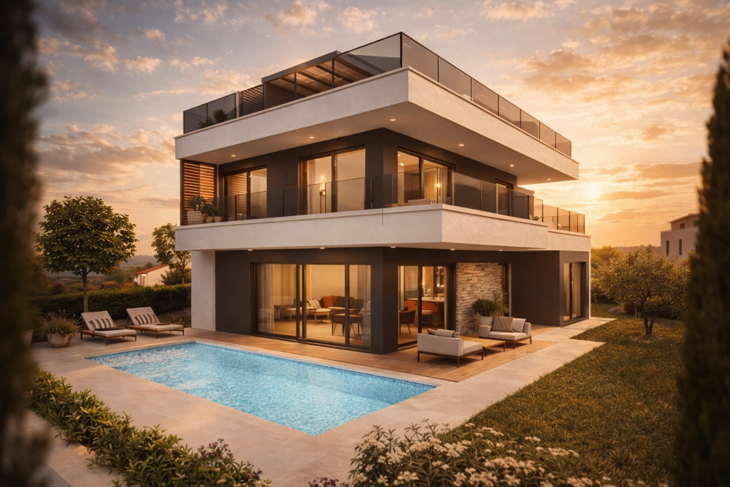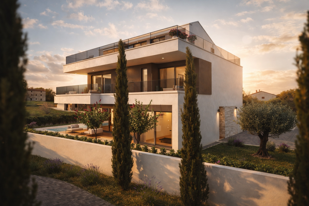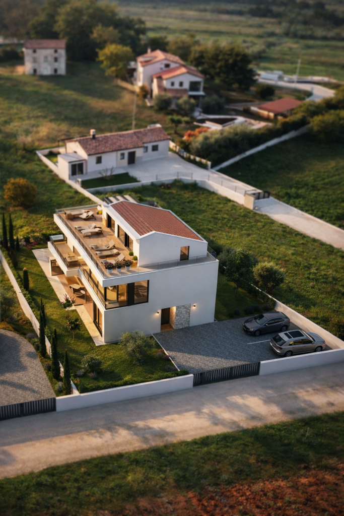 Architektur ist mehr als Form – sie ist ein Lebensgefühl. Diese exklusive Neubauvilla nahe Poreč verbindet moderne Klarheit mit hochwertigem Wohnkomfort in ruhiger Umgebung.