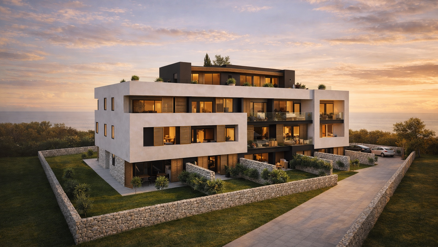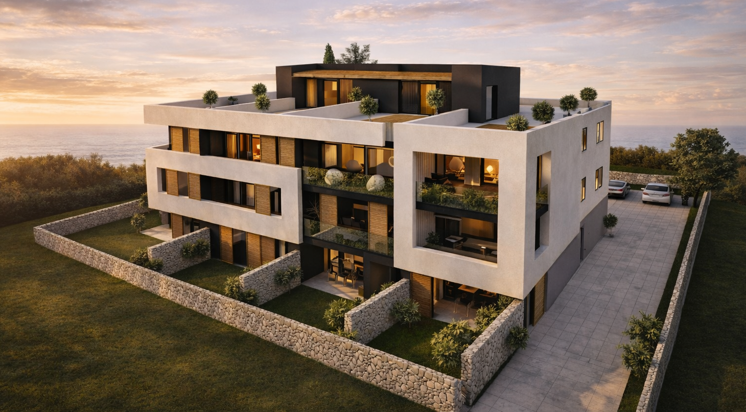 Der offen gestaltete Wohn- und Küchenbereich mit 39,06 m² bildet den zentralen Treffpunkt der Wohnung und öffnet sich zur großzügigen Loggia. Große Fensterflächen sorgen für eine angenehme Wohnatmosphäre und eröffnen den Blick auf die Adria sowie die umliegende Berglandschaft – ideal für entspannte Momente oder gesellige Abende.