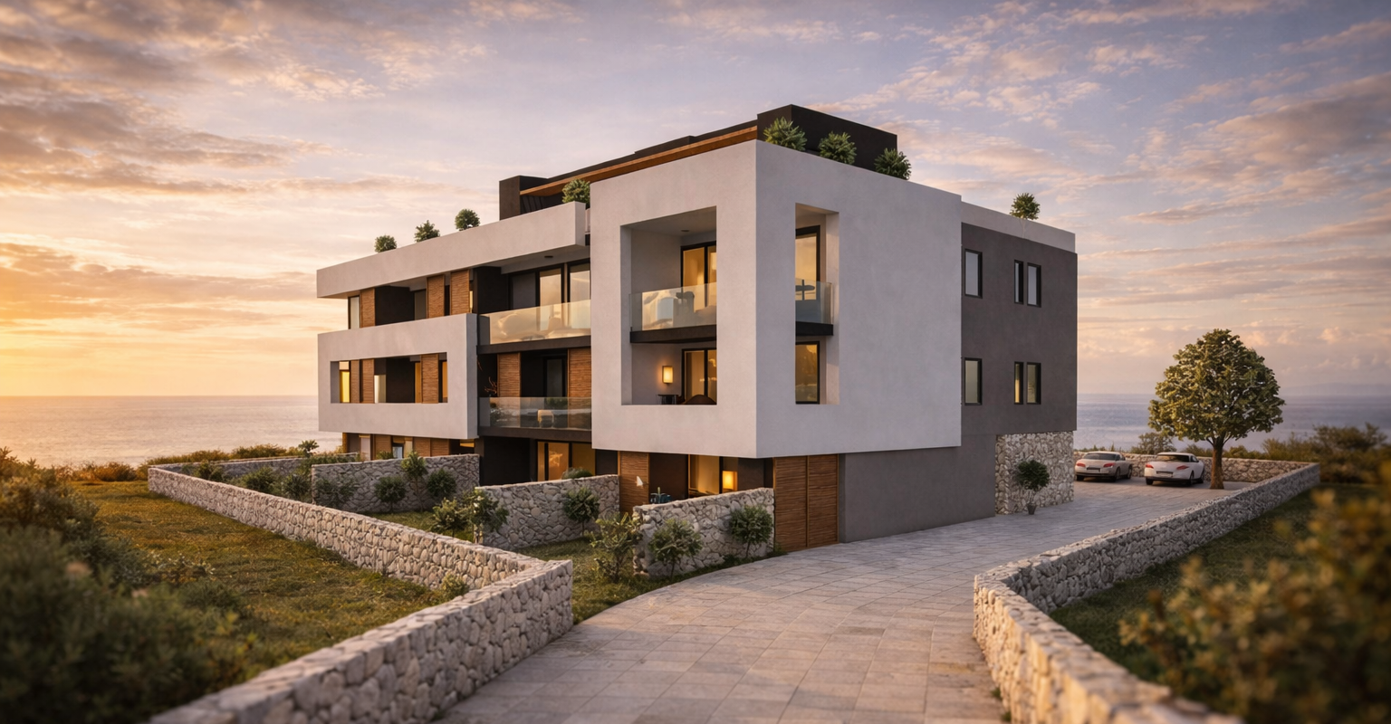 Bereits der erste Eindruck vermittelt ein Gefühl von Großzügigkeit und Ruhe – diese stilvolle 3-Zimmer-Wohnung verbindet klare Architektur mit einer außergewöhnlichen Lage nahe dem Strand. Der Blick auf Meer und Berge bildet eine beeindruckende Kulisse und verleiht dem Wohnambiente eine besondere Tiefe. Großzügige Innenräume treffen auf weitläufige Außenflächen und schaffen ein harmonisches Zusammenspiel aus Komfort, Privatsphäre und Lebensqualität.
