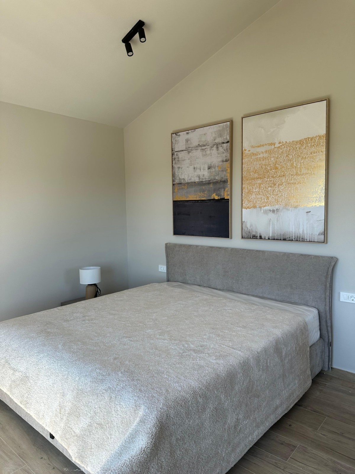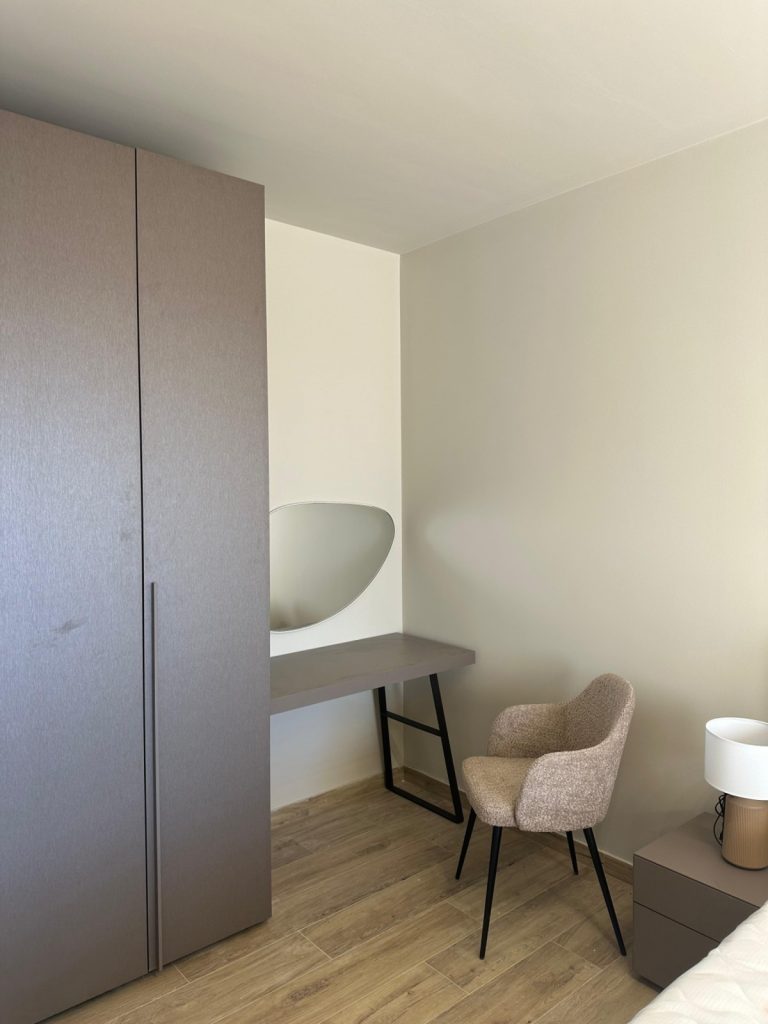 Im ersten Obergeschoss befinden sich zwei Schlafzimmer mit jeweils eigenem Badezimmer sowie Zugang zu einer Terrasse. Die oberste Etage bildet einen privaten Rückzugsbereich mit weiterem Schlafzimmer, großzügigem Badezimmer, begehbarem Kleiderschrank und vorbereitetem Bereich für eine Sauna. Die überdachte Terrasse eröffnet einen ruhigen Meerblick, der die besondere Lage dieser Immobilie unterstreicht.