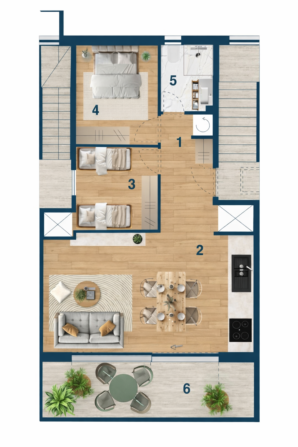 Gebäude 2 überwacht sechs durchdacht geplante Dreizimmerwohnungen. Die erhöhte Position sorgt sowohl für freie Blickachsen über Stadt und Küste und verleiht dem Objekt eine besondere Qualität – emotional als auch wirtschaftlich.