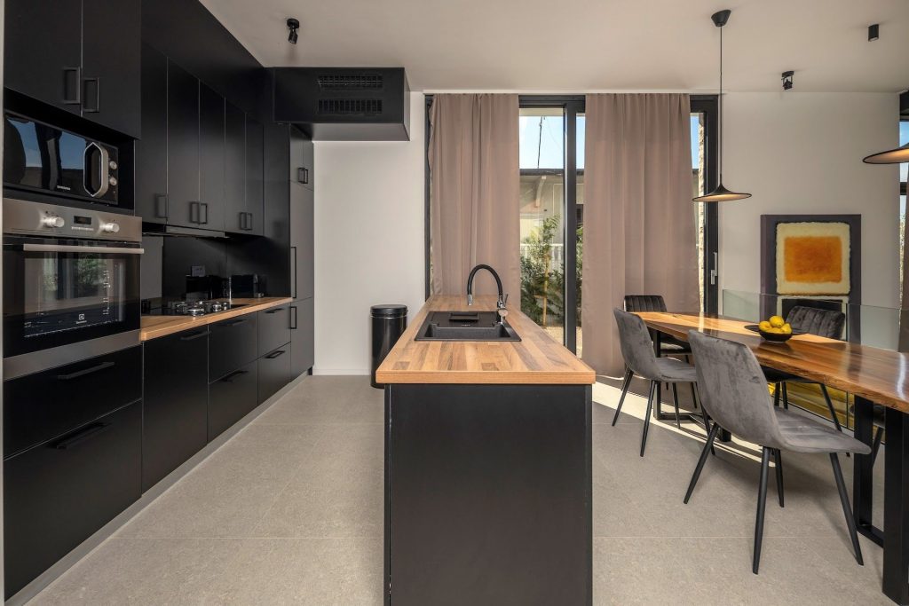 Exklusive Ausstattung : Designerküche, Esszimmer und direkter Zugang zur Sonnenterrasse mit Lounge und Grillzone.