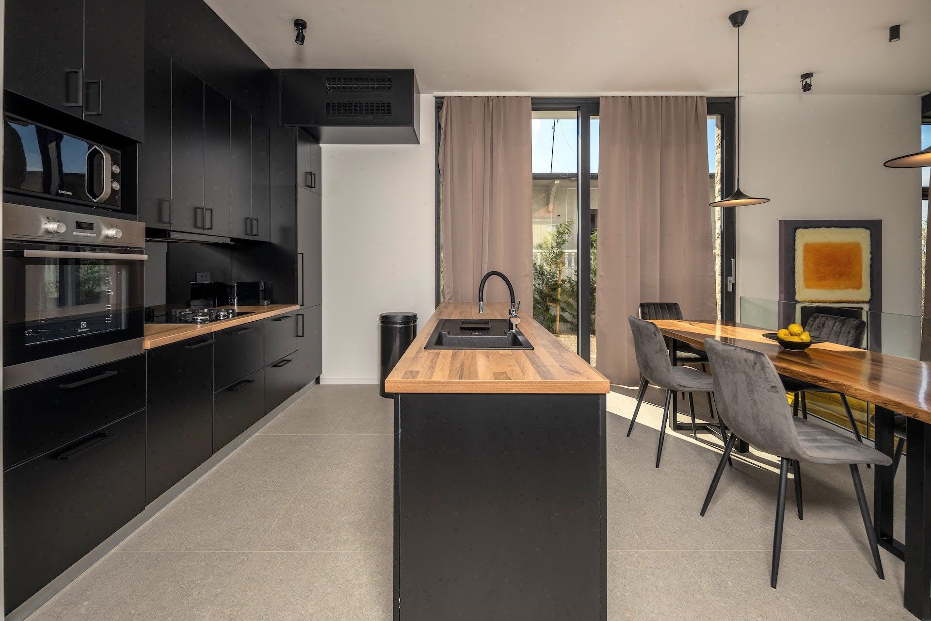 Exklusive Ausstattung : Designerküche, Esszimmer und direkter Zugang zur Sonnenterrasse mit Lounge und Grillzone.