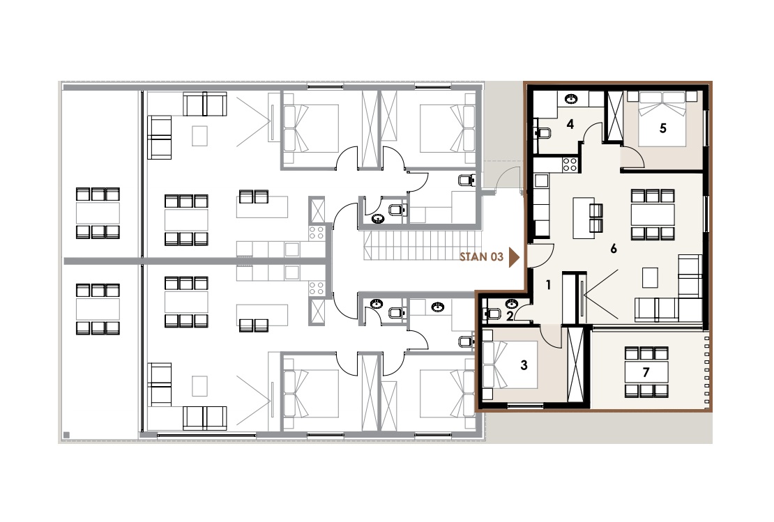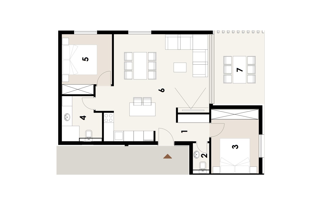 Auf 68,81 m² entfaltet sich ein durchdachtes Raumkonzept mit offenem Wohn-, Ess- und Kochbereich, zwei komfortablen Schlafzimmern, einem eleganten Badezimmer sowie separatem WC. Großzügige Glasflächen durchfluten die Räume mit Licht und eröffnen einen unverbaubaren Blick auf die Adriaküste.