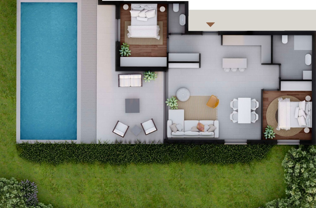 Der private Garten mit 64,23 m² bildet gemeinsam mit der 12,81 m² großen überdachten Terrasse und dem 36 m² umfassenden Swimmingpool ein exklusives Outdoor-Ensemble – geschaffen für Ruhe, Sonne und stilvolle Momente unter freiem Himmel. Ein zugeordneter Stellplatz mit 11,50 m² ergänzt das Angebot.