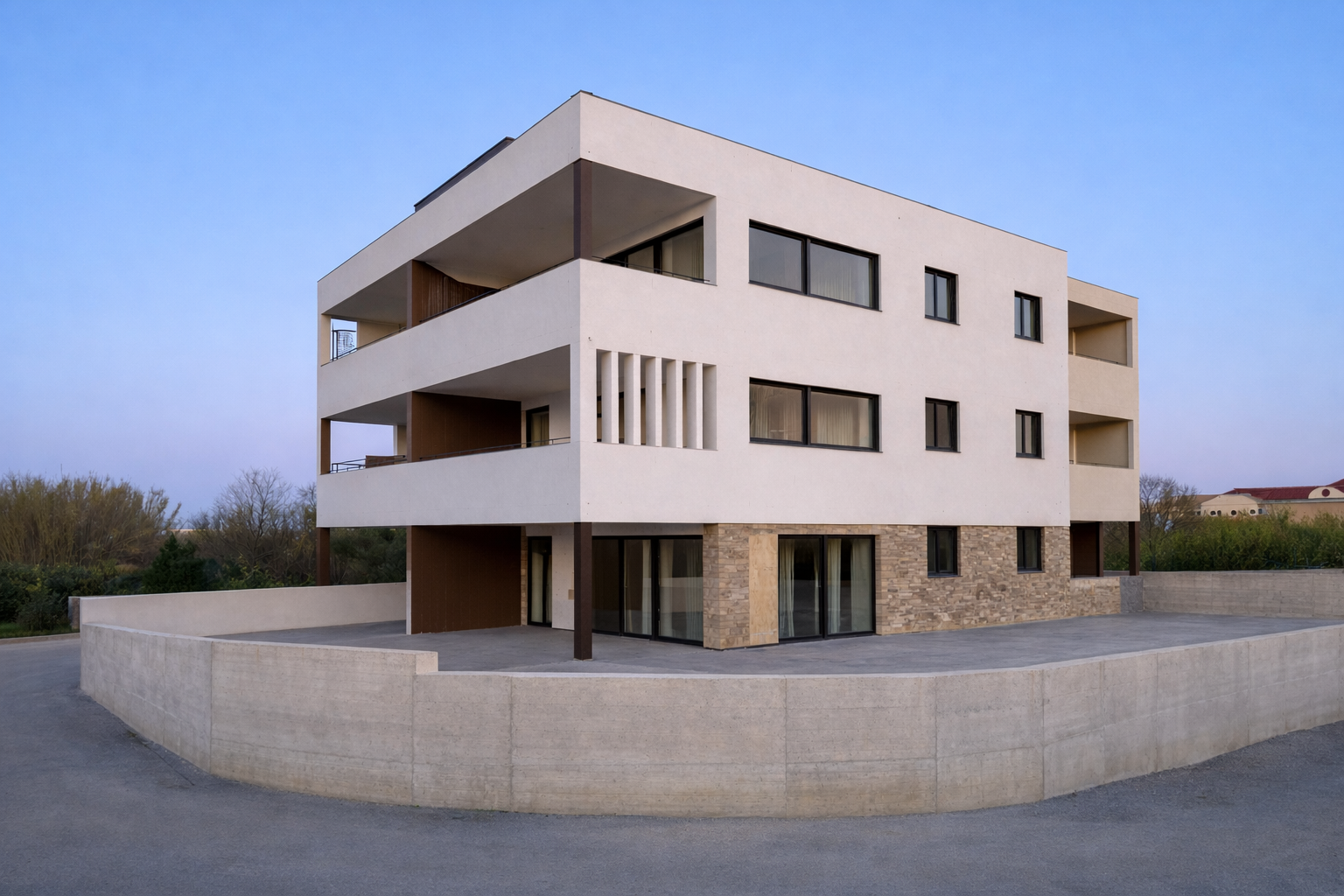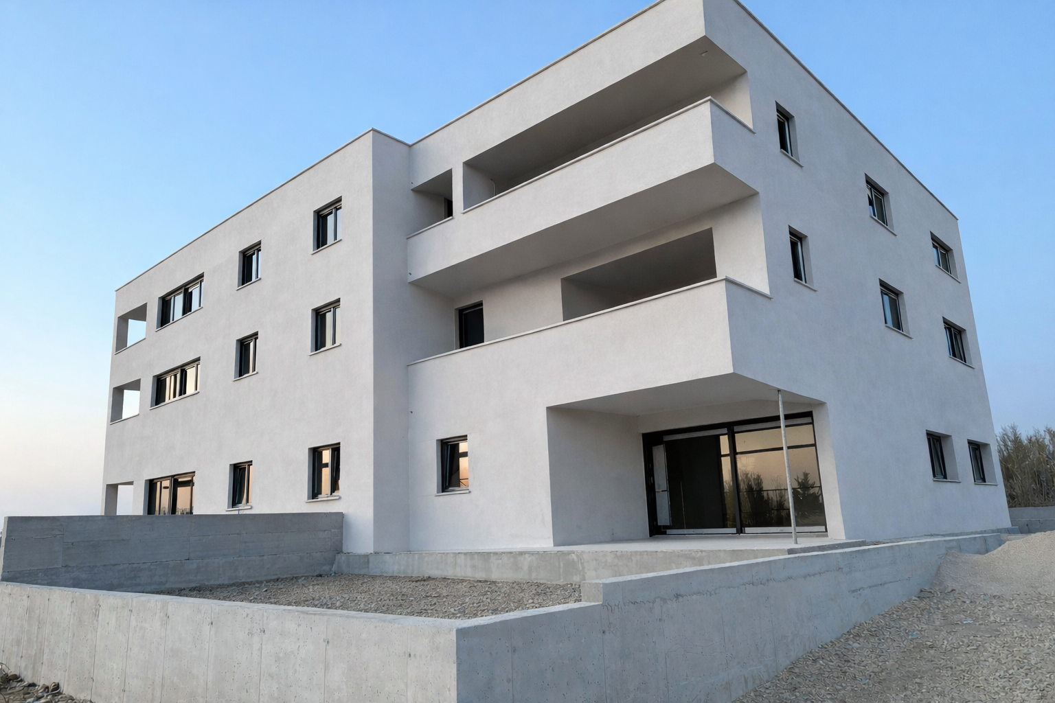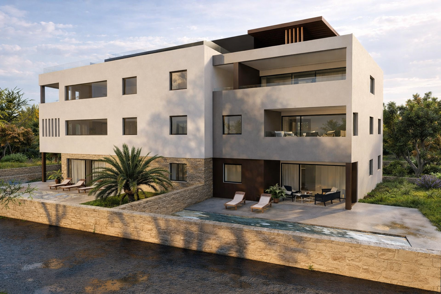 Energieklasse A+, elektrische Fußbodenheizung, Klimageräte in allen Räumen, hochwertige Keramikfliesen sowie moderne PVC-/Aluminiumfenster mit elektrischen Rollläden und Insektenschutz stehen für zeitgemäßen Komfort. Die mediterran gestaltete Außenanlage unterstreicht den architektonischen Anspruch dieses Projekts.