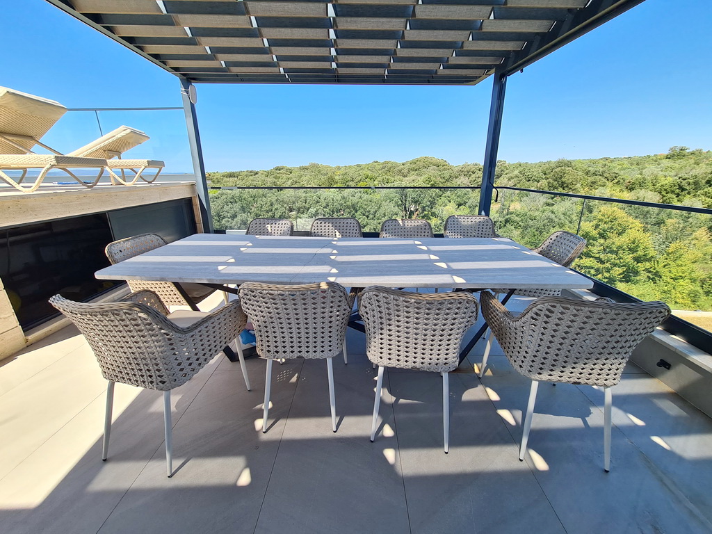 Der offen gestaltete Wohn- und Essbereich überzeugt durch Großzügigkeit, klare Linien und bodentiefe Glasflächen mit direktem Zugang zur überdachten Terrasse. Die moderne Küche fügt sich elegant in das Gesamtbild ein. Drei Schlafzimmer mit jeweils eigenem Badezimmer sowie zusätzliche Garderobenbereiche bieten höchsten Komfort und maximale Privatsphäre. Das absolute Highlight ist die private Dachterrasse mit rund 200 m² Fläche und Resort-Charakter. Beheizter Pool, Sonnendeck, Sauna, Whirlpool, Außendusche sowie eine stilvolle Outdoor-Küche mit überdachtem Essbereich schaffen ein exklusives Ambiente mit unvergleichlichem Panoramablick auf das Meer und die umliegenden Inseln.