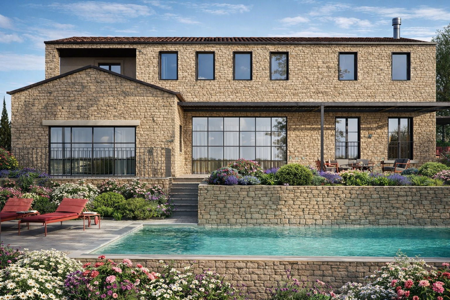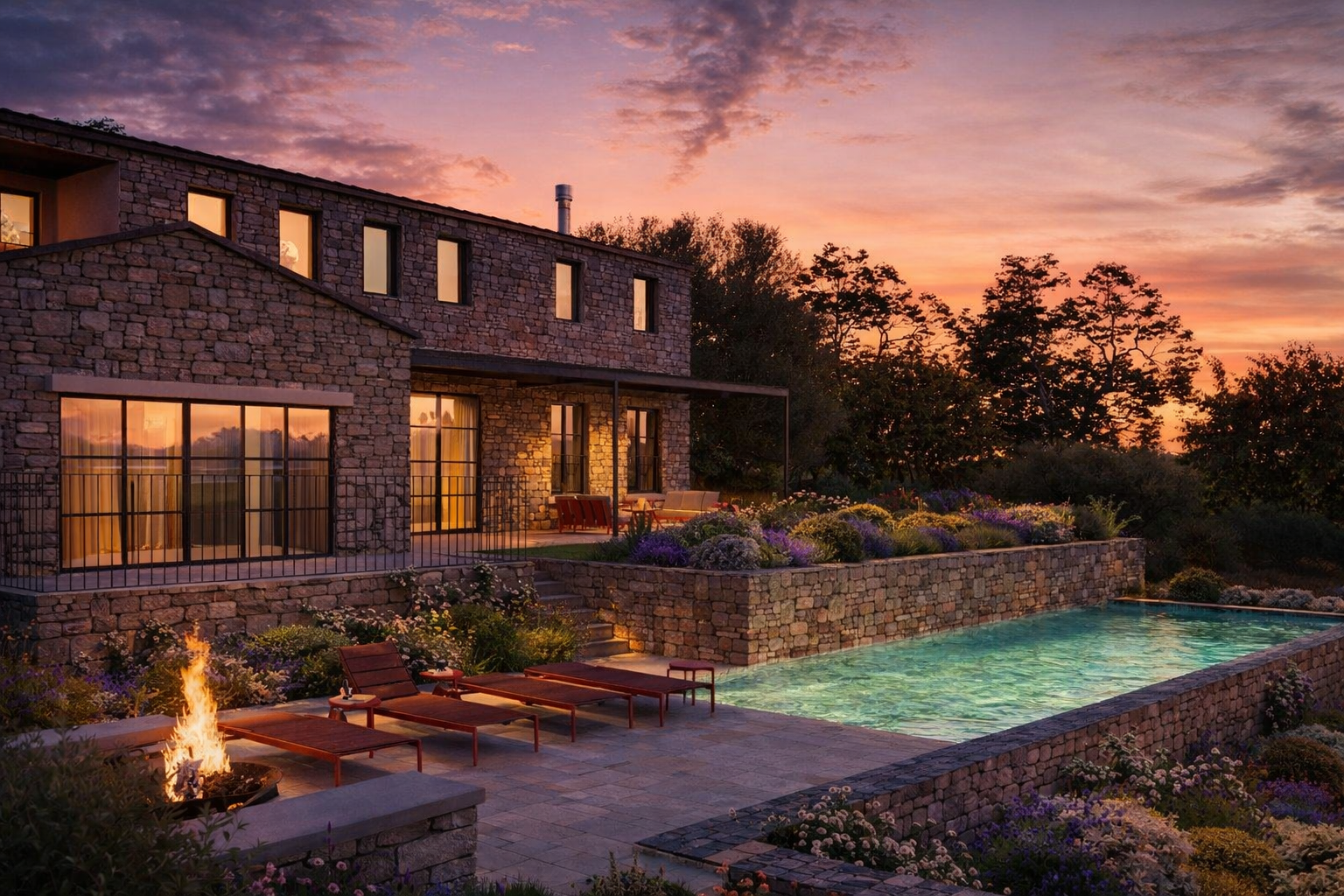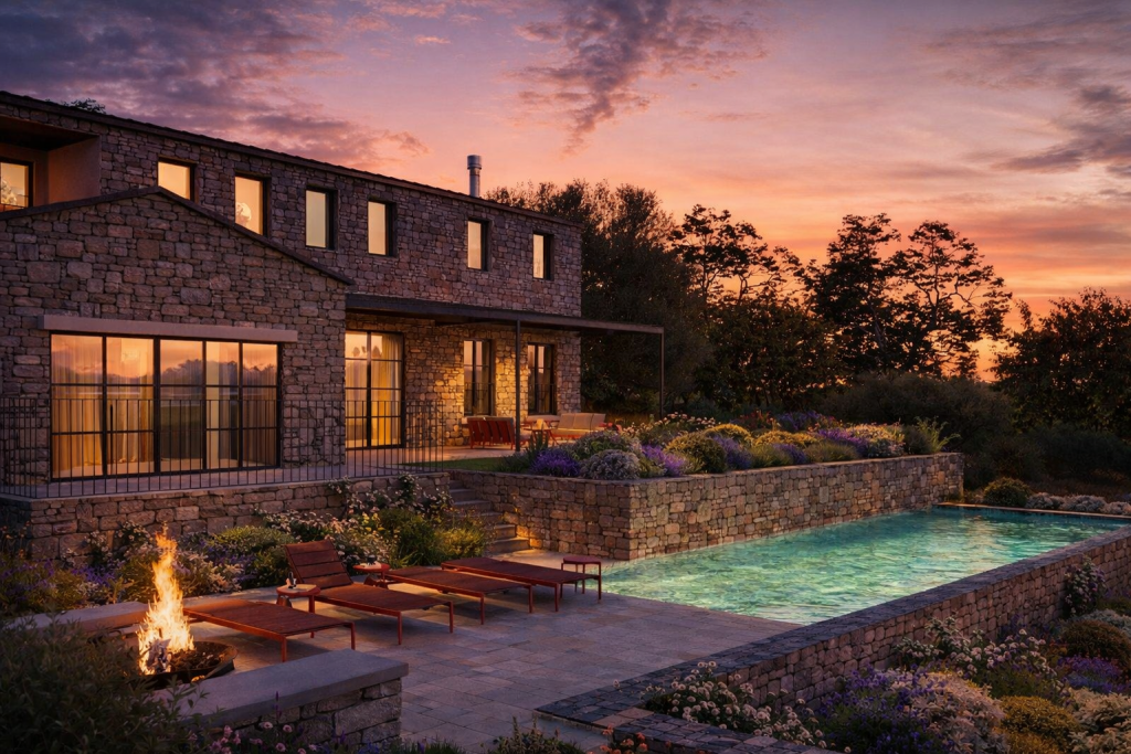 Sanftes Licht, weite Horizonte und die ruhige Landschaft Istriens verleihen diesem Ort eine besondere Atmosphäre. Architektur und Umgebung treten hier in eine harmonische Verbindung – geprägt von Naturstein, klaren Linien und einer Gestaltung, die Tradition und modernen Wohnkomfort miteinander vereint.