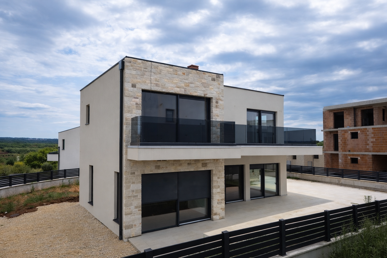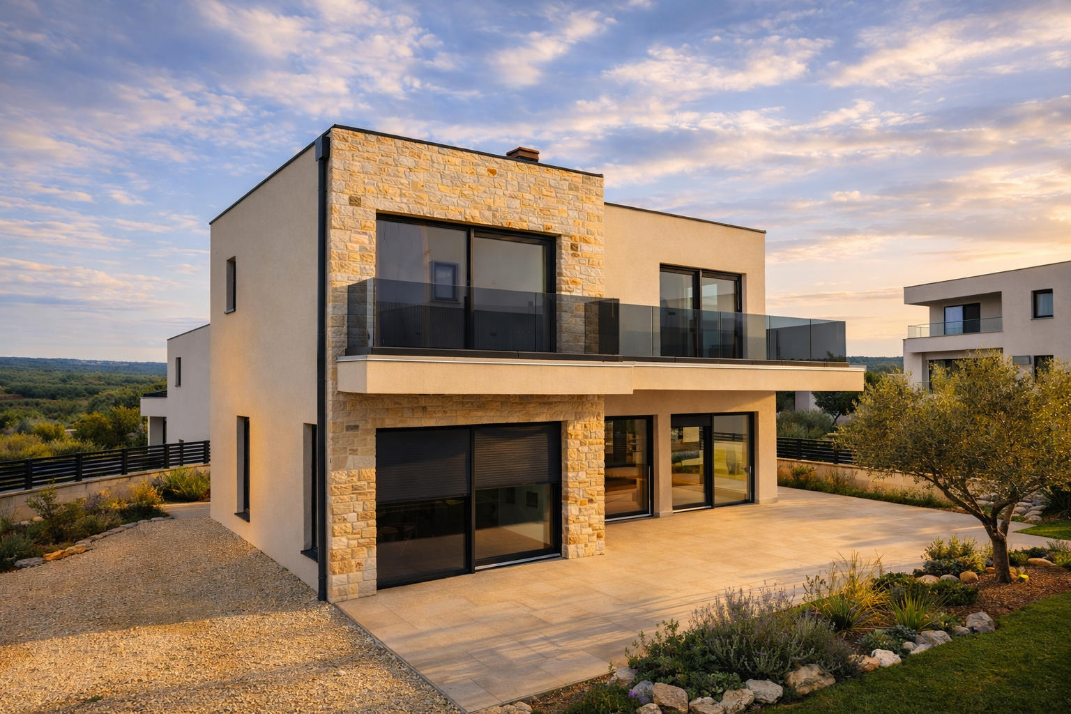 Ein Ort, an dem moderne Architektur auf mediterrane Lebensqualität trifft: In ruhiger Lage der Region Tar–Vabriga, nur wenige Minuten vom Meer und etwa 7 km von Poreč entfernt, entsteht dieses freistehende Neubauhaus mit beheiztem Pool – ideal für Eigennutzung oder als wertbeständige Ferienimmobilie.