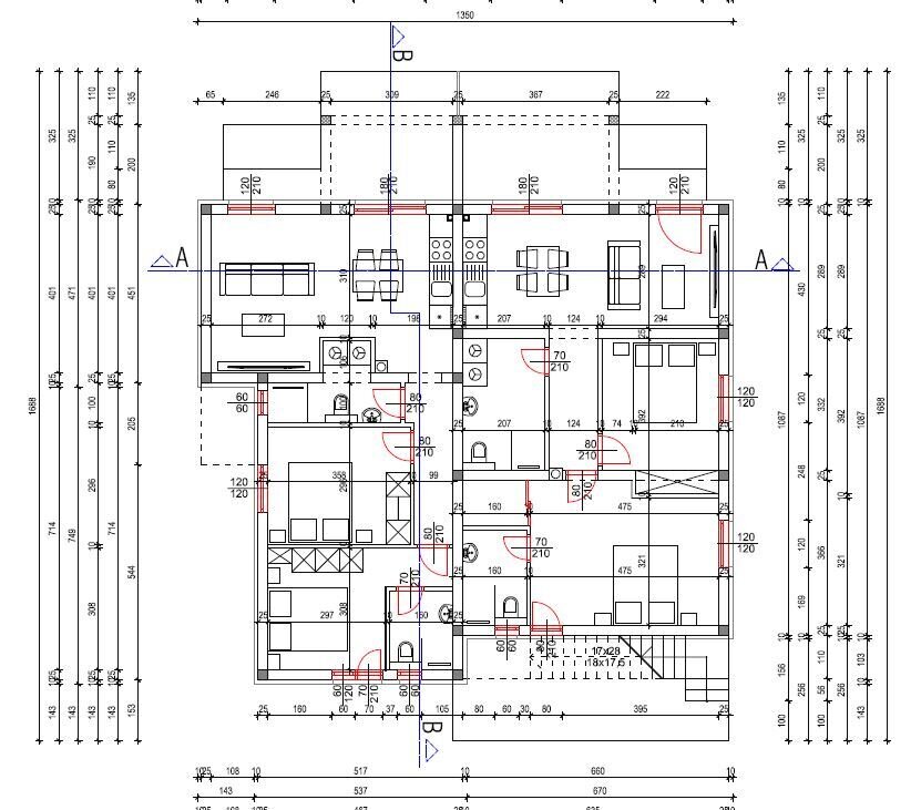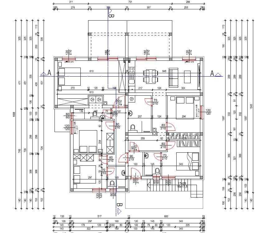 Die Villa bietet eine Gesamtfläche von 316 m² und ist in drei komfortable Wohneinheiten gegliedert. Zwei Apartments im Erdgeschoss verfügen über offene Wohn-, Ess- und Küchenbereiche, jeweils zwei Schlafzimmer, zwei Badezimmer sowie überdachte Terrassen. Das Obergeschoss beherbergt ein großzügiges Apartment, aufgeteilt in zwei separate Wohneinheiten mit jeweils zwei Schlafzimmern und überdachten Terrassen mit beeindruckendem Meerblick.
