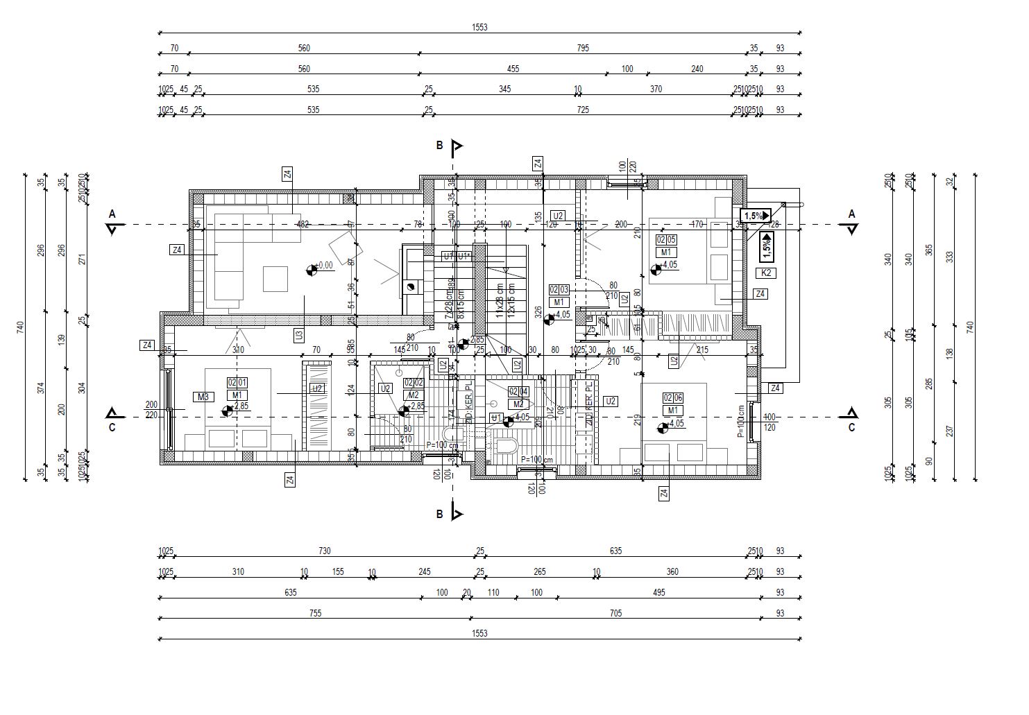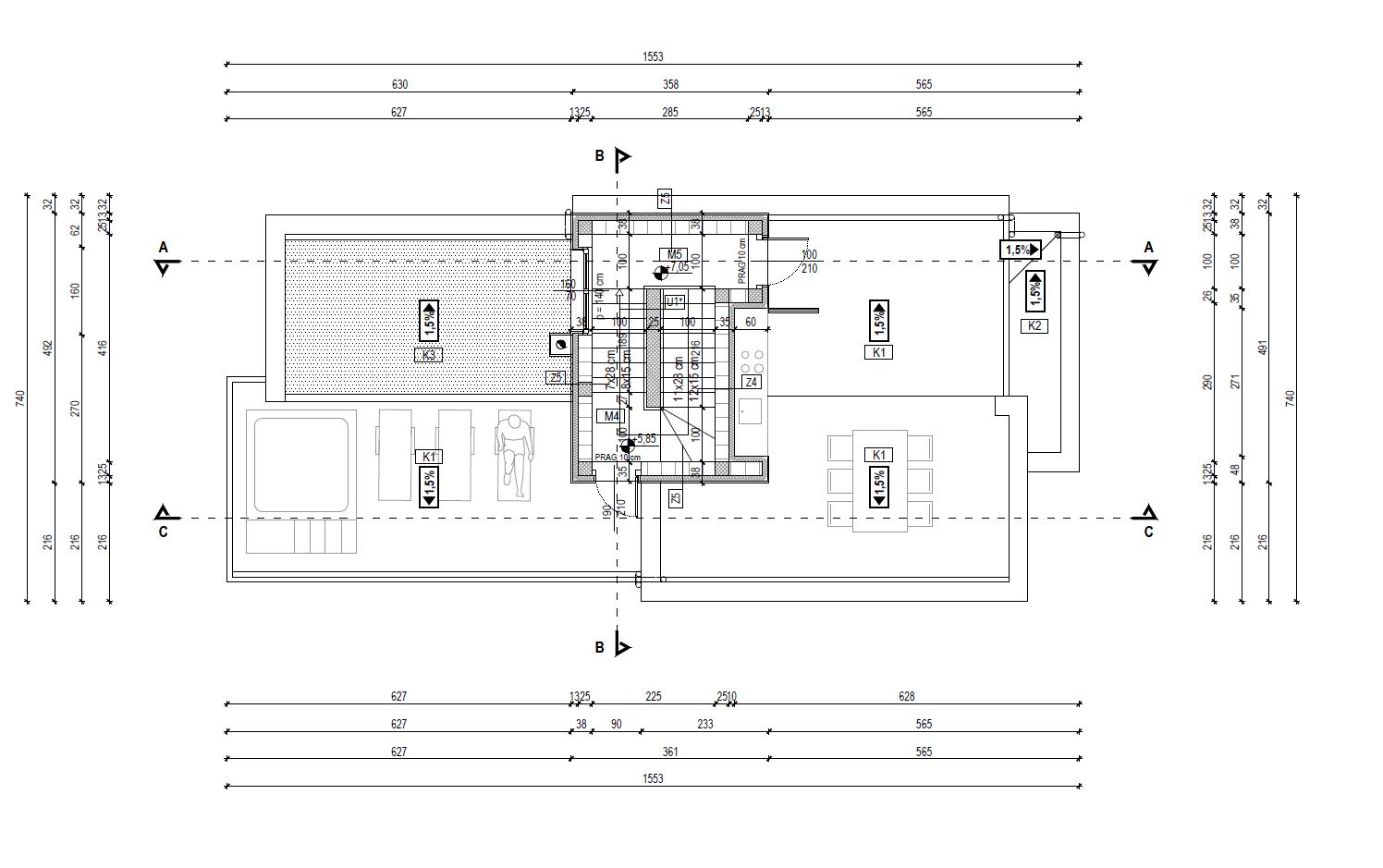 Die Gesamtfläche beträgt 260 m² auf einem Grundstück von 436 m² und verteilt sich auf drei Ebenen: