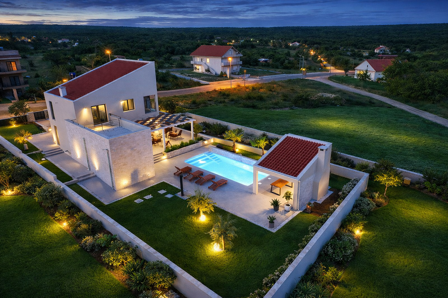 Schon die Zufahrt vermittelt ein Gefühl von Weite und Ruhe – dieses außergewöhnliche Anwesen nahe Zadar eröffnet einen Lebensraum, der Privatsphäre, Komfort und mediterrane Leichtigkeit auf seltene Weise vereint.