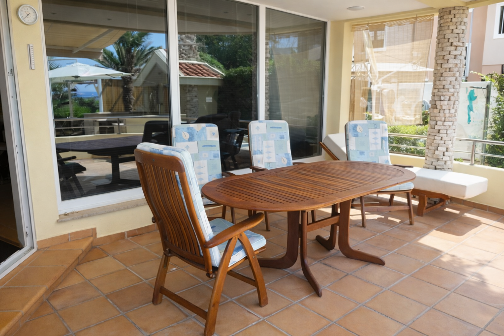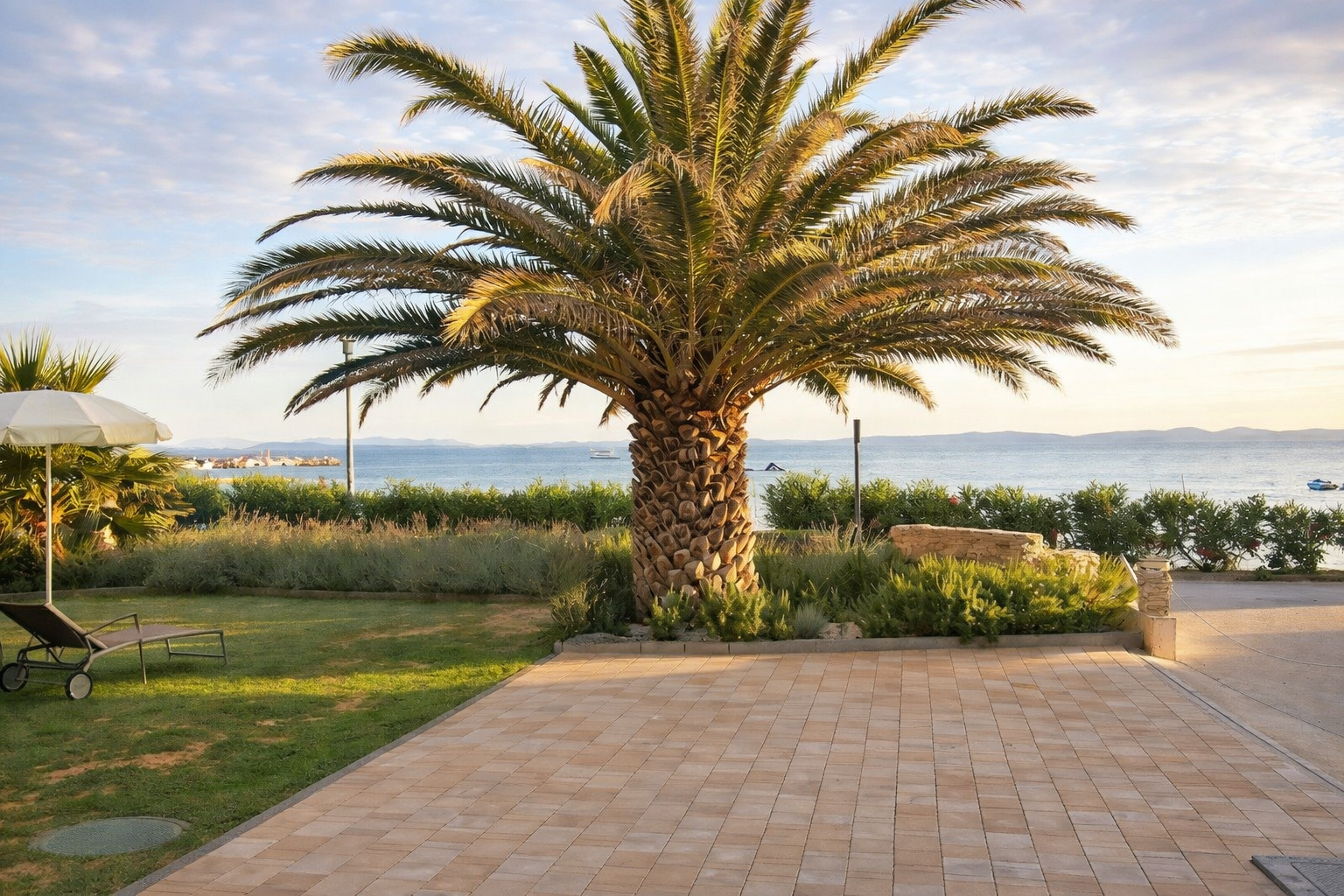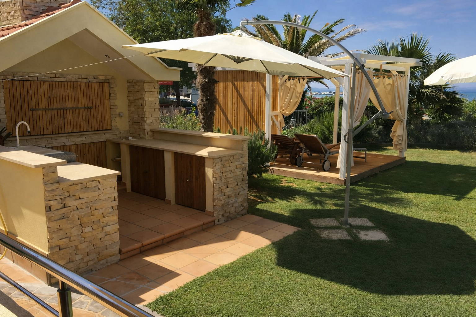 Ein besonderes Highlight bildet der etwa 160 m² große Garten, der mit gemauertem Grill, eleganter Pergola und Außendusche eine exklusive Outdoor-Atmosphäre schafft. Hier genießen Sie Privatsphäre und mediterrane Lebensqualität in ihrer schönsten Form – nur wenige Meter vom kristallklaren Wasser entfernt.