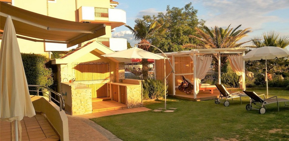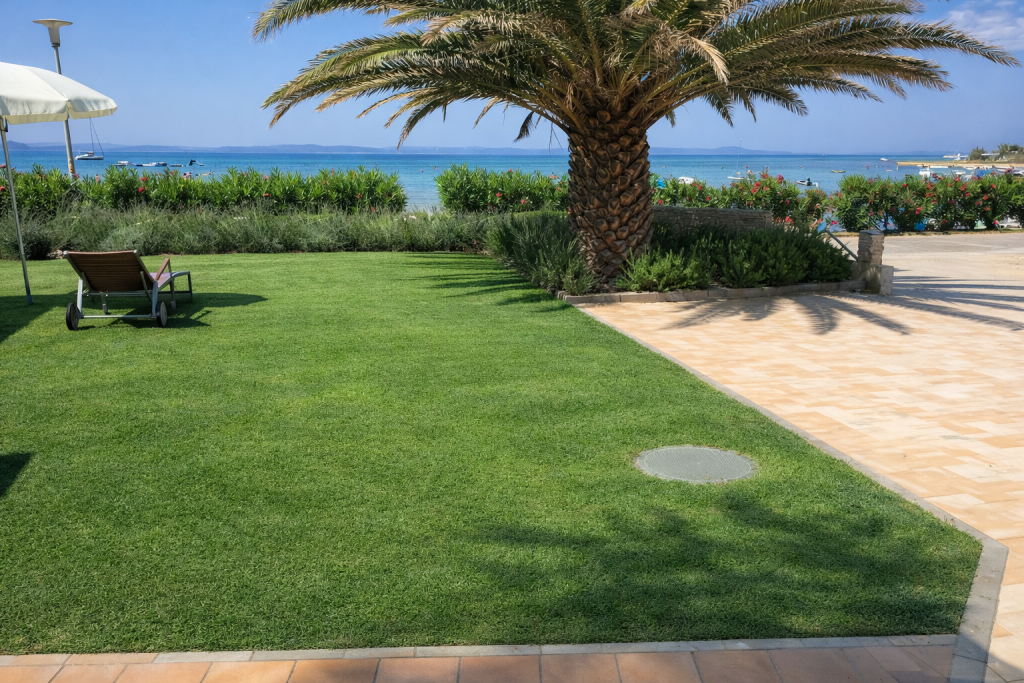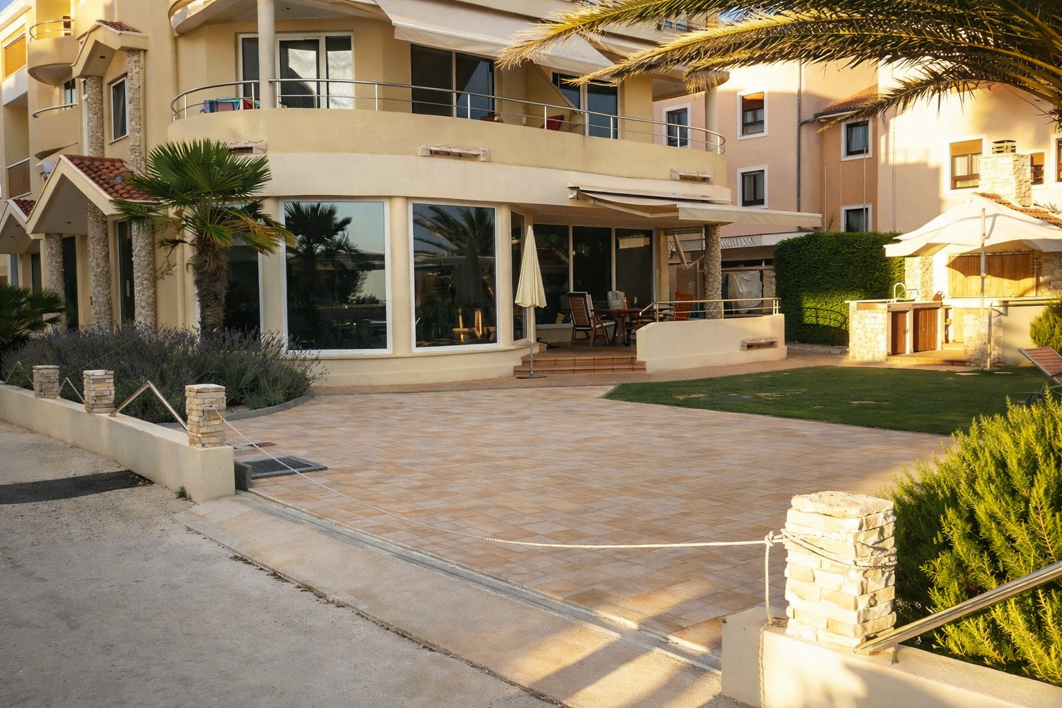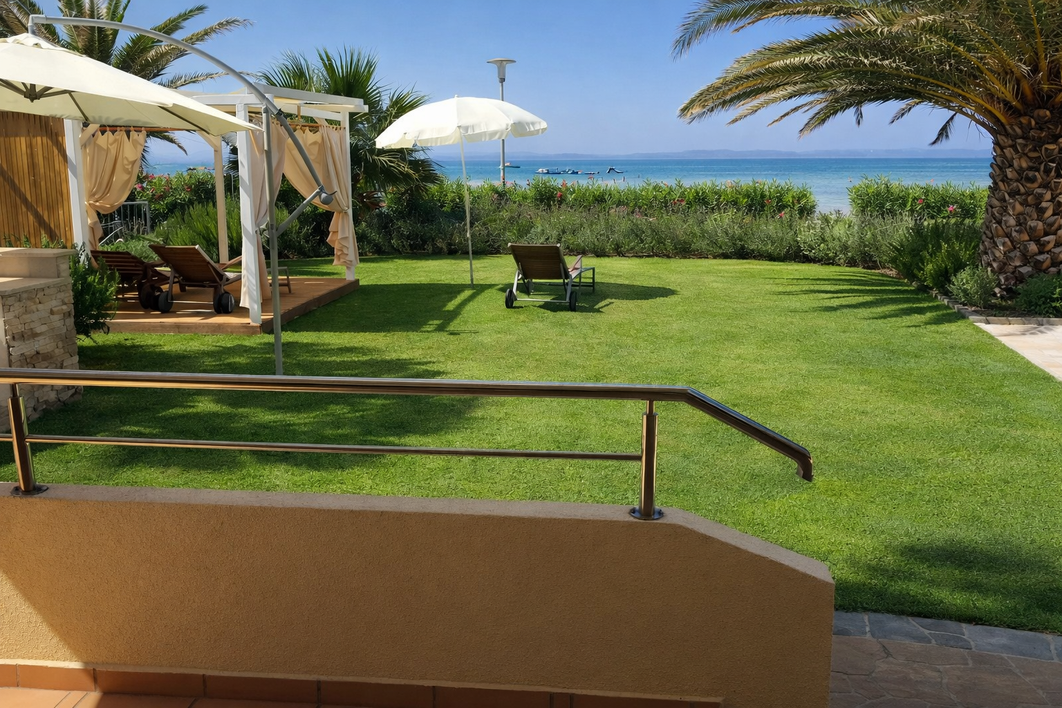 Ein besonderes Highlight bildet der etwa 160 m² große Garten, der mit gemauertem Grill, eleganter Pergola und Außendusche eine exklusive Outdoor-Atmosphäre schafft. Hier genießen Sie Privatsphäre und mediterrane Lebensqualität in ihrer schönsten Form – nur wenige Meter vom kristallklaren Wasser entfernt.