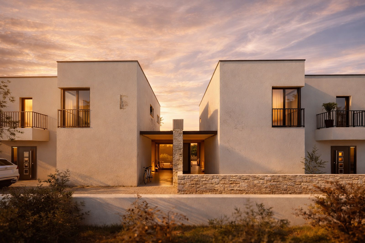 Zur hochwertigen Ausstattung zählen Fußbodenheizung über Wärmepumpe, Daikin-Klimageräte in allen Räumen, Aluminiumfenster mit elektrischen Rollläden sowie einbruchhemmende Eingangstüren. Das eingefriedete Grundstück ist gepflegt angelegt und verfügt über zwei private Außenstellplätze.