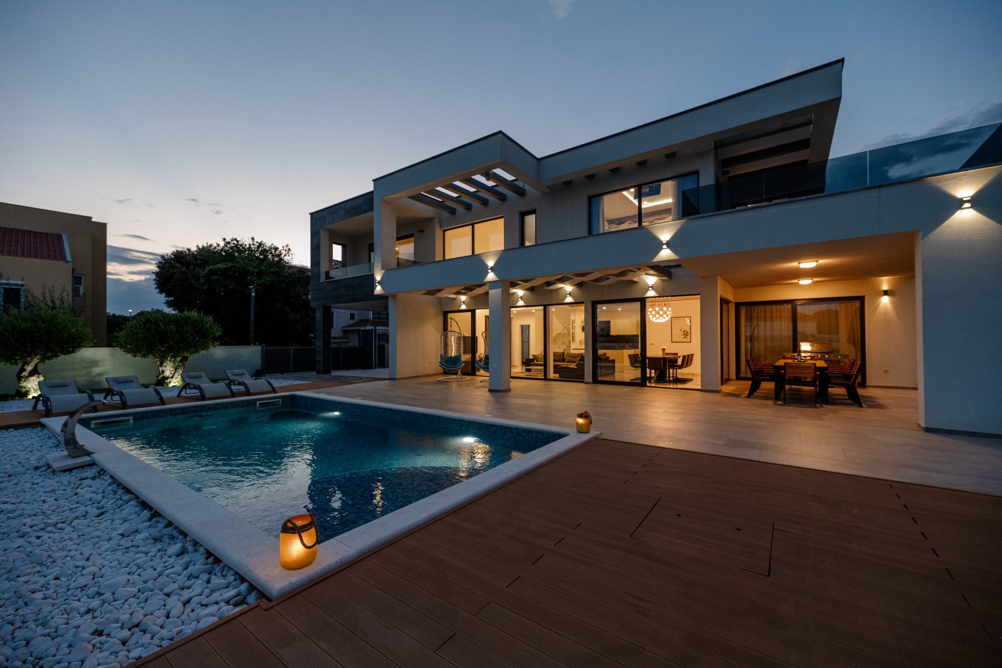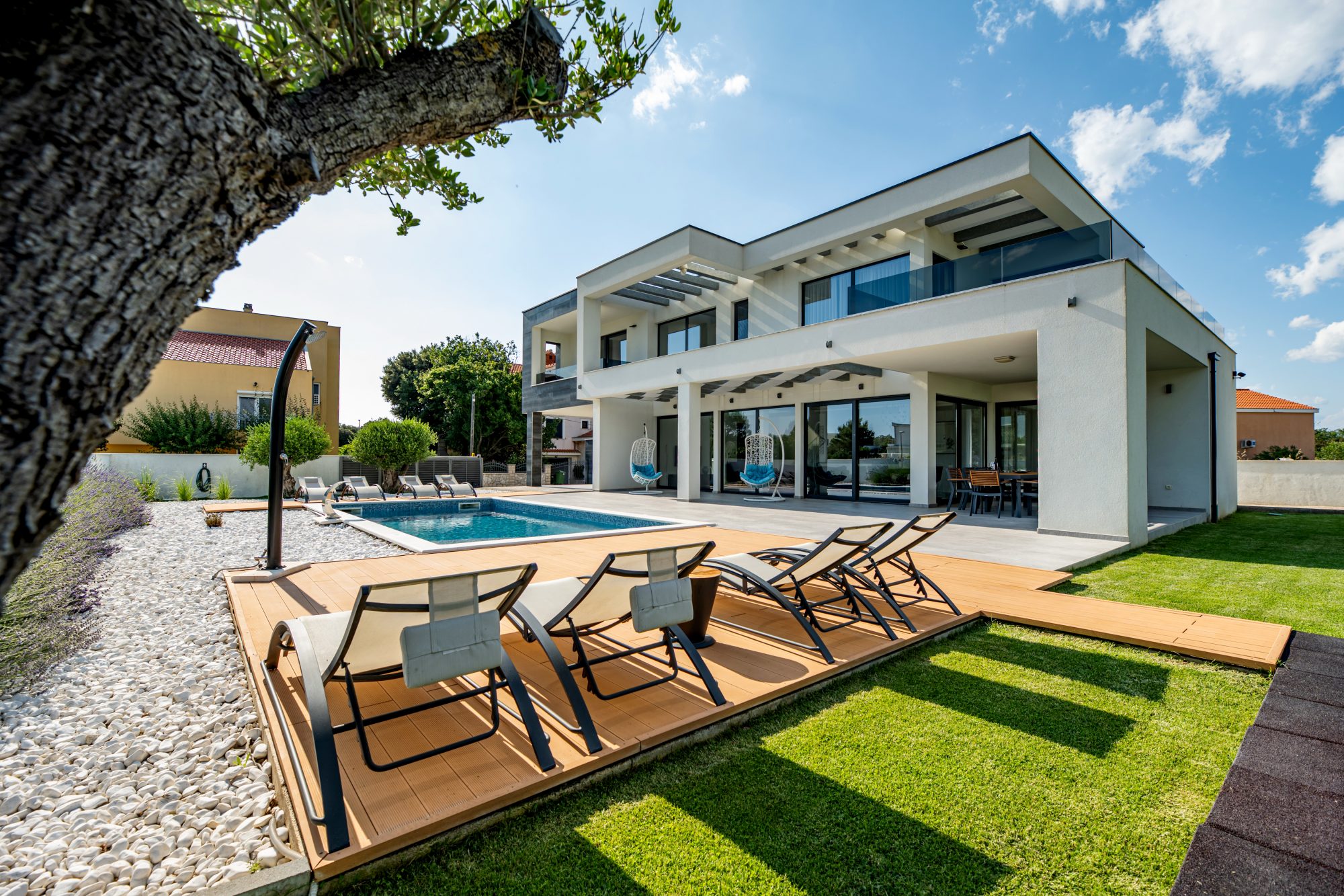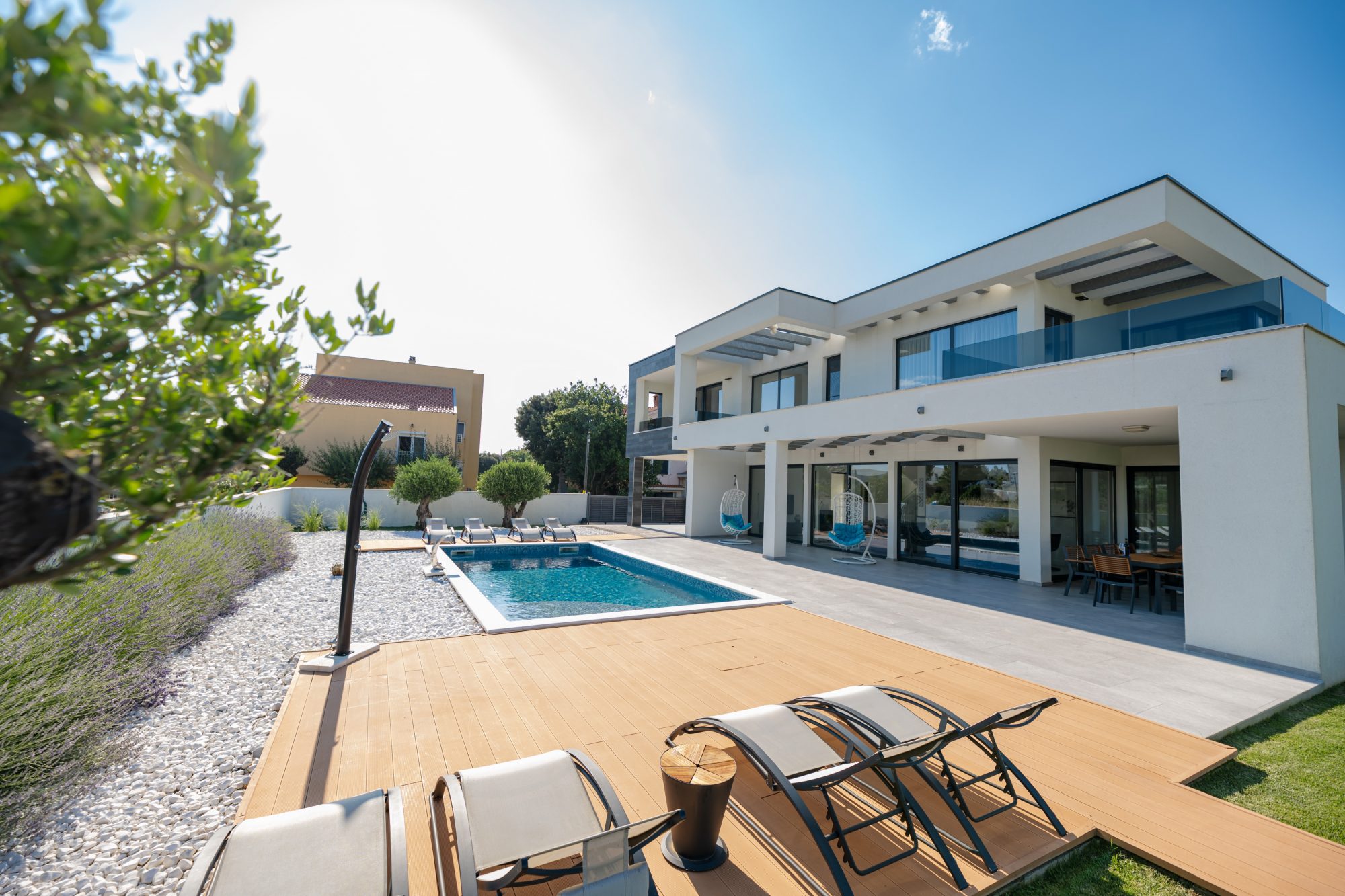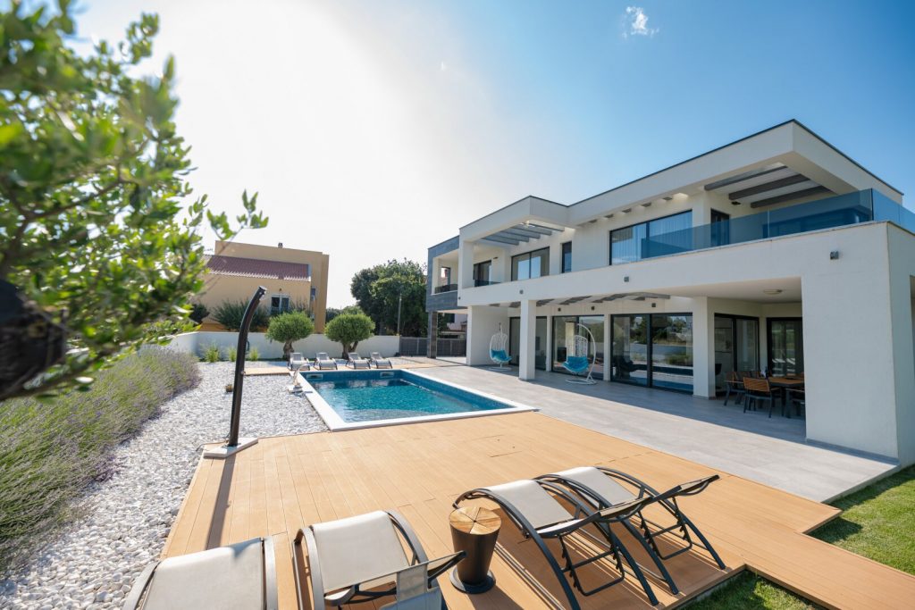 Diese elegante Villa klare Architektur mit mediterraner Leichtigkeit in ruhiger Lage nahe Zadar. Auf einem 854 m² großen Grundstück bietet sie 158,8 m² Wohnfläche auf zwei Ebenen sowie drei Terrassen, davon zwei überdacht, und einen stilvoll gestalteten Außenbereich.