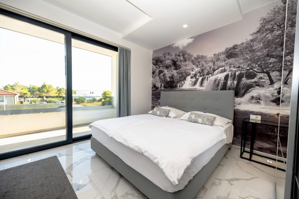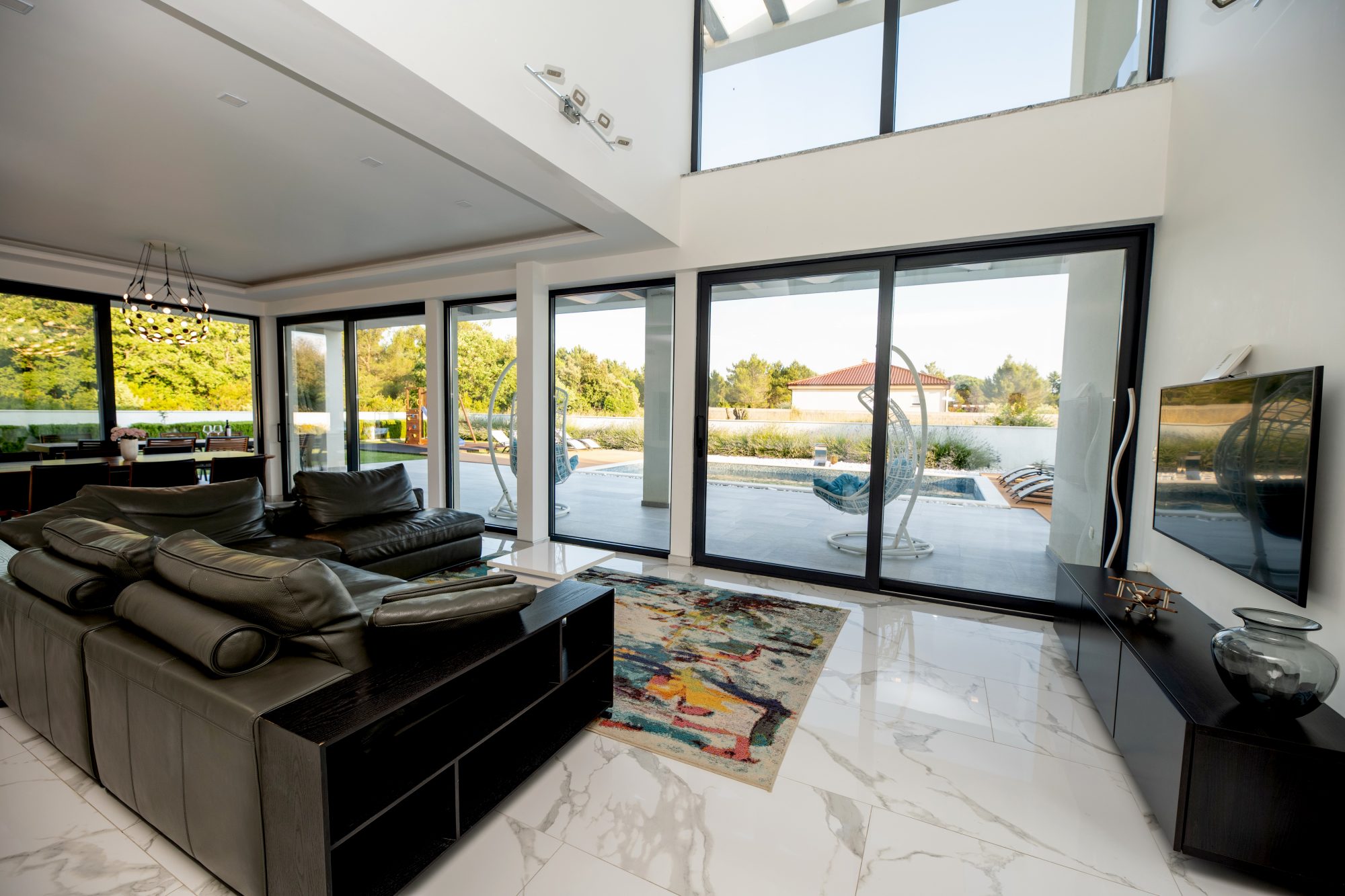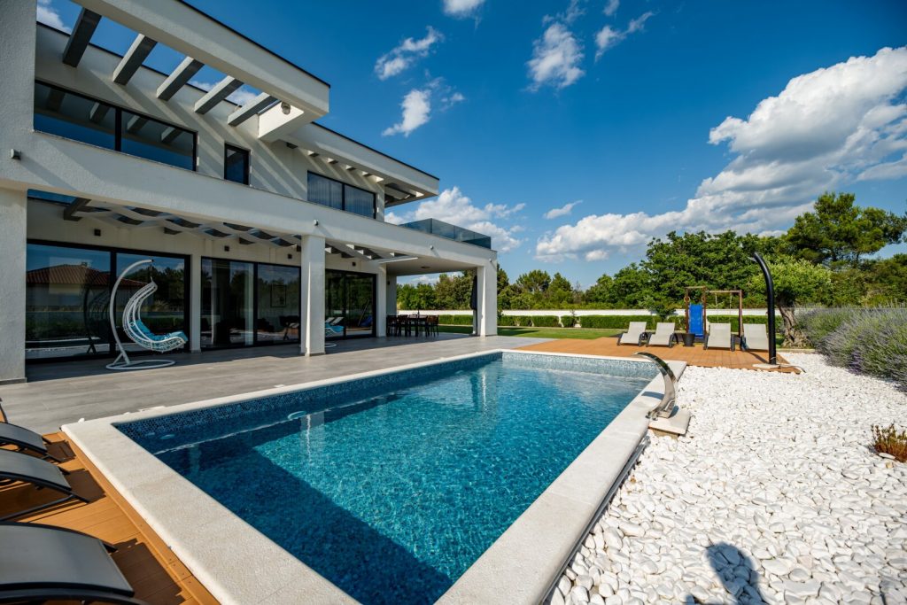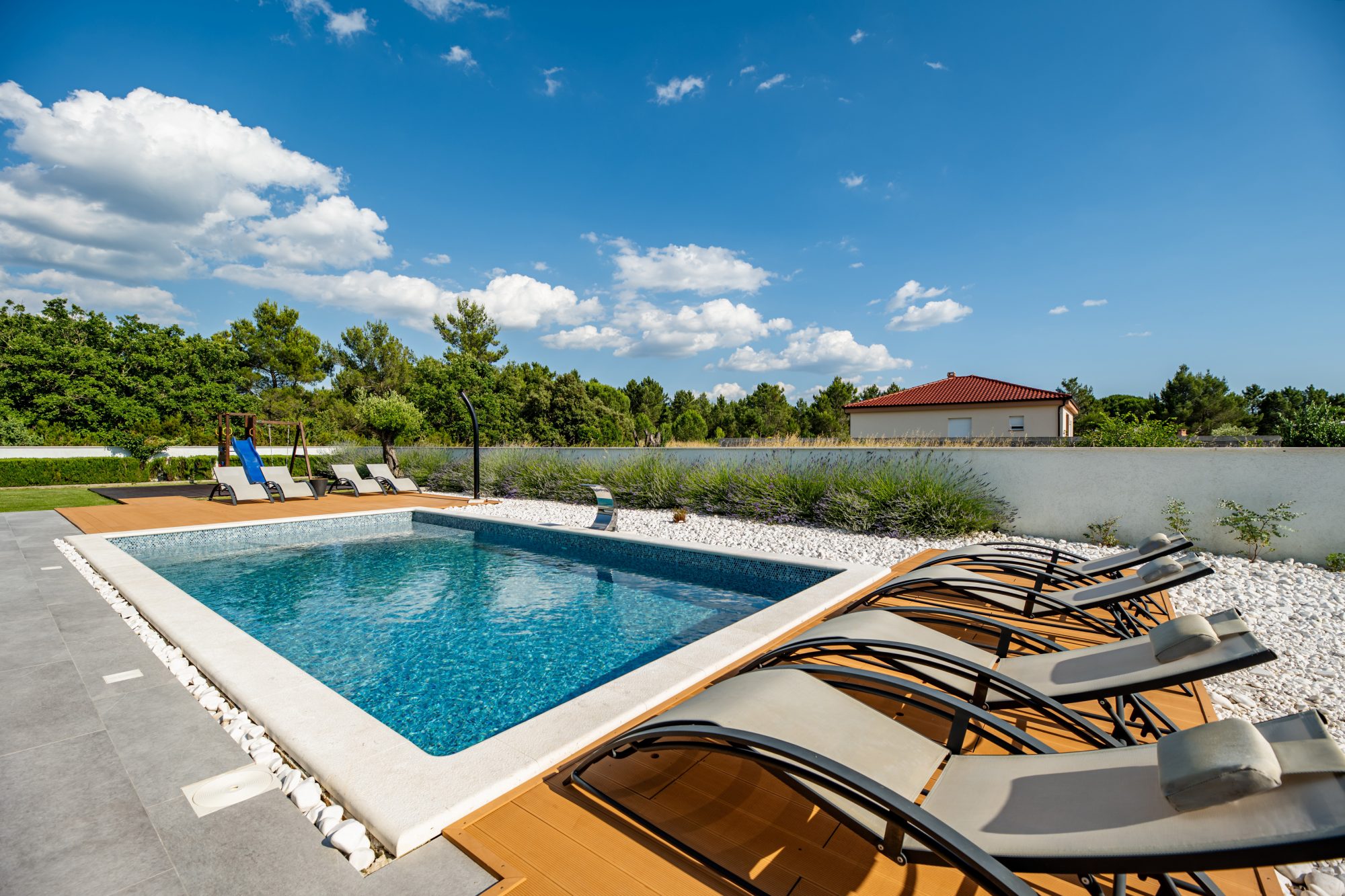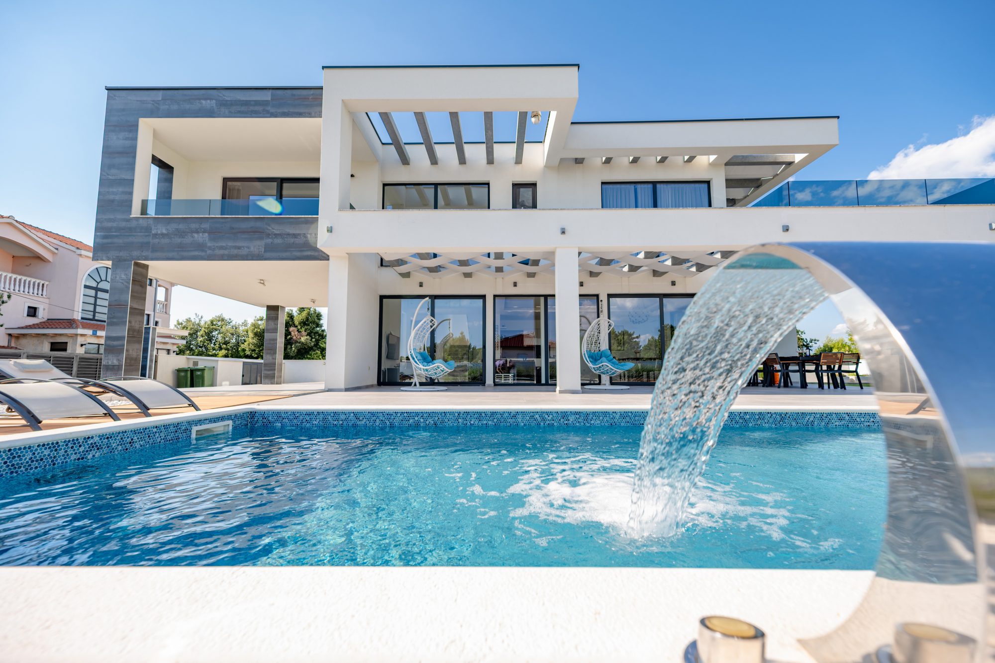 Diese elegante Villa klare Architektur mit mediterraner Leichtigkeit in ruhiger Lage nahe Zadar. Auf einem 854 m² großen Grundstück bietet sie 158,8 m² Wohnfläche auf zwei Ebenen sowie drei Terrassen, davon zwei überdacht, und einen stilvoll gestalteten Außenbereich.