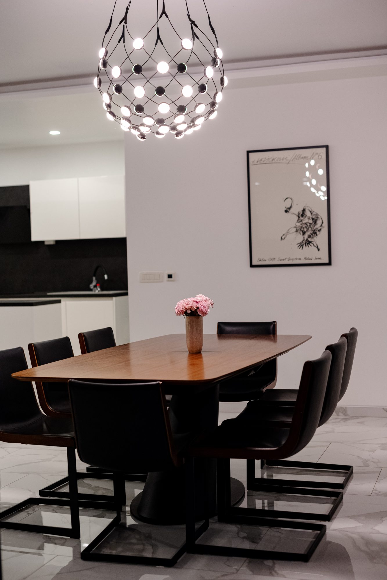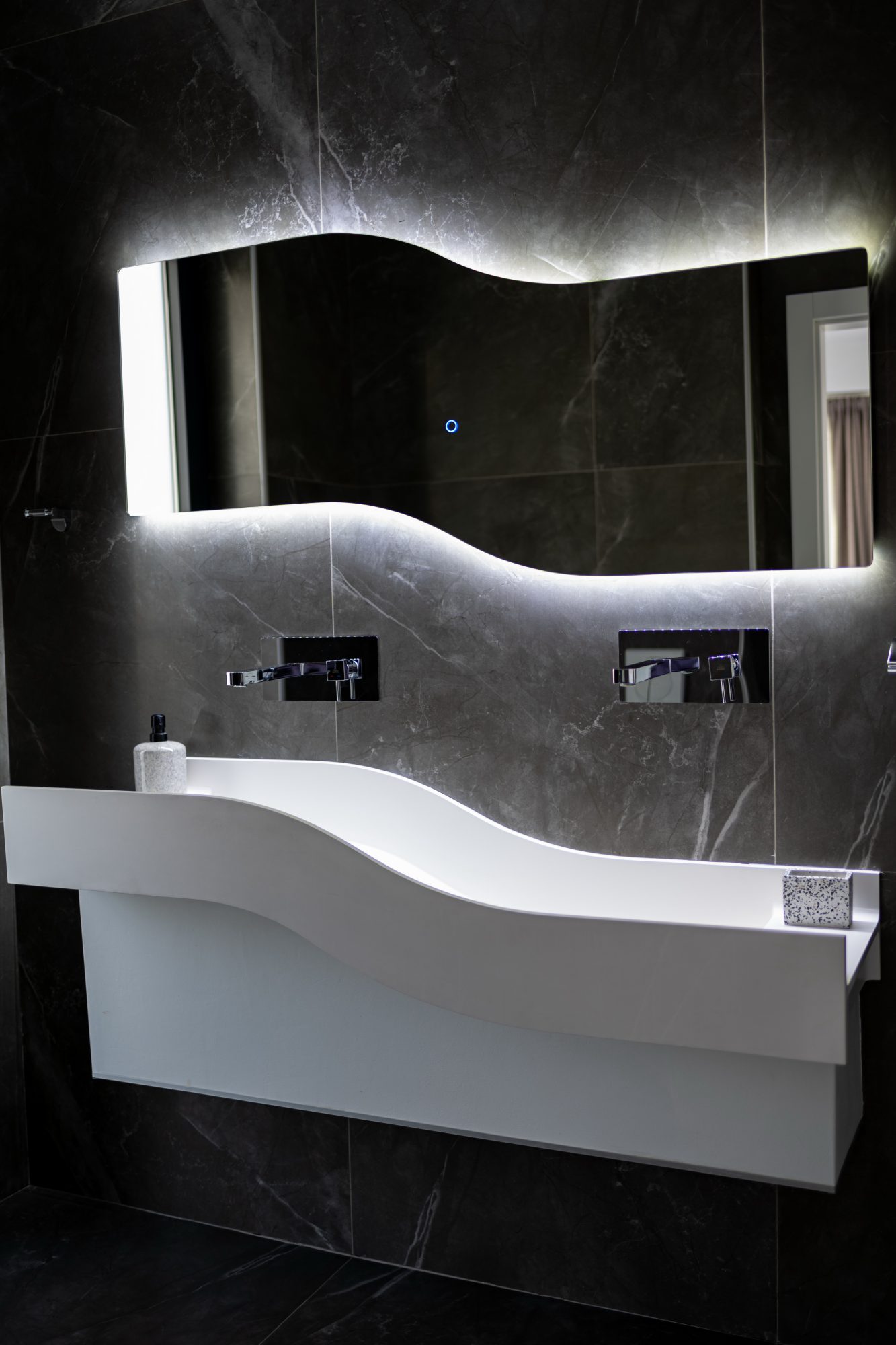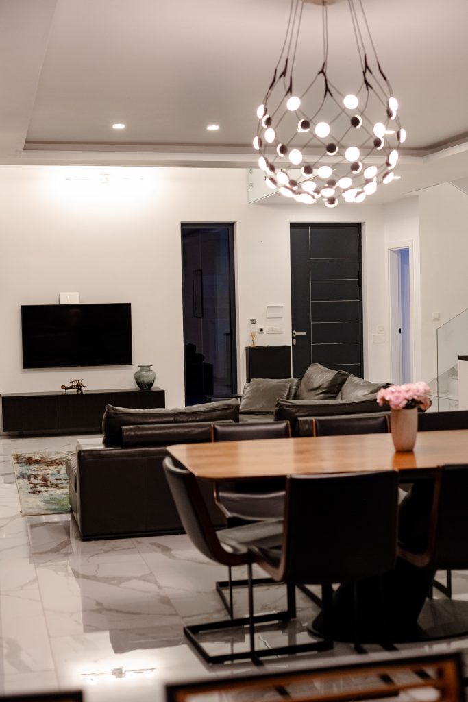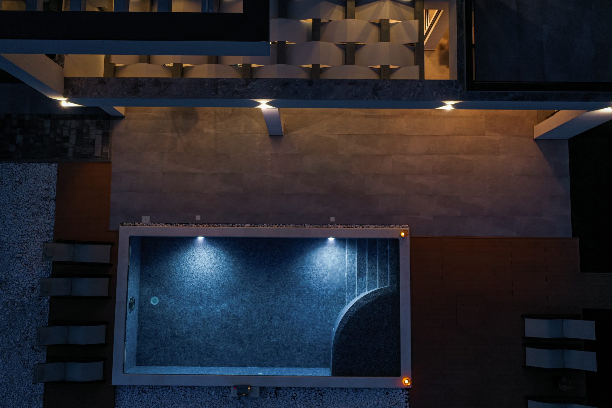 Der offen konzipierte Wohn-, Ess- und Küchenbereich öffnet sich über großzügige Glasflächen zur überdachten Terrasse mit Außen-Essplatz, Sonnendeck und beheiztem 32-m²-Salzwasserpool mit Wasserfall und Gegenstromanlage. Ein Schlafzimmer mit eigenem Bad sowie zwei Abstellräume befinden sich im Erdgeschoss. Im Obergeschoss stehen drei klimatisierte Schlafzimmer mit jeweils eigenem Badezimmer und Terrassenzugang zur Verfügung, eine davon überdacht.