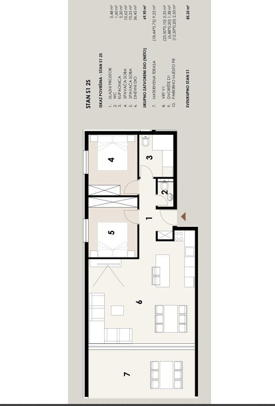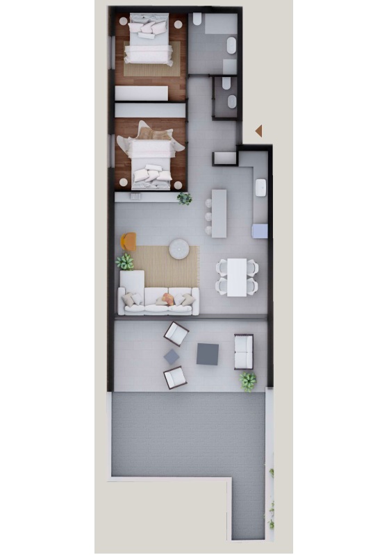 Der Wohnbereich von 69,90 m² umfasst einen Eingangsbereich, einen großzügigen Wohn-/Ess-/Küchenbereich, zwei Schlafzimmer, ein Badezimmer und ein separates WC. Das Interieur wird durch eine überdachte Terrasse (18,44 m²), einen privaten Garten (30,38 m²) und einen privaten Parkplatz (12,50 m²) ergänzt – ideal für entspanntes Wohnen mit zusätzlichem Außenraum.