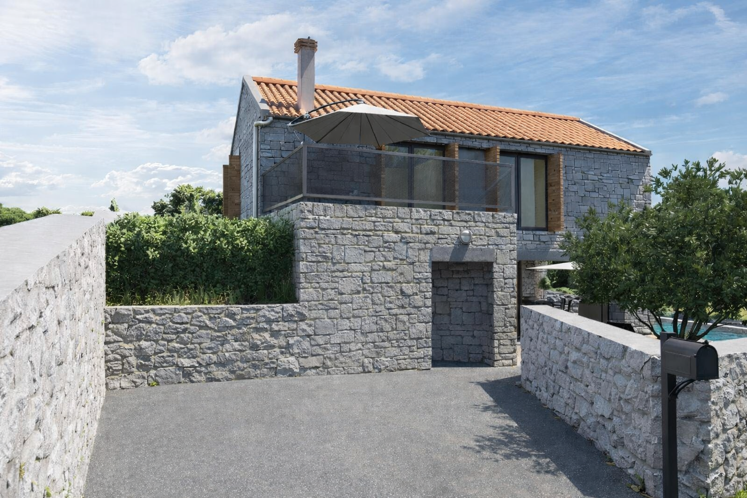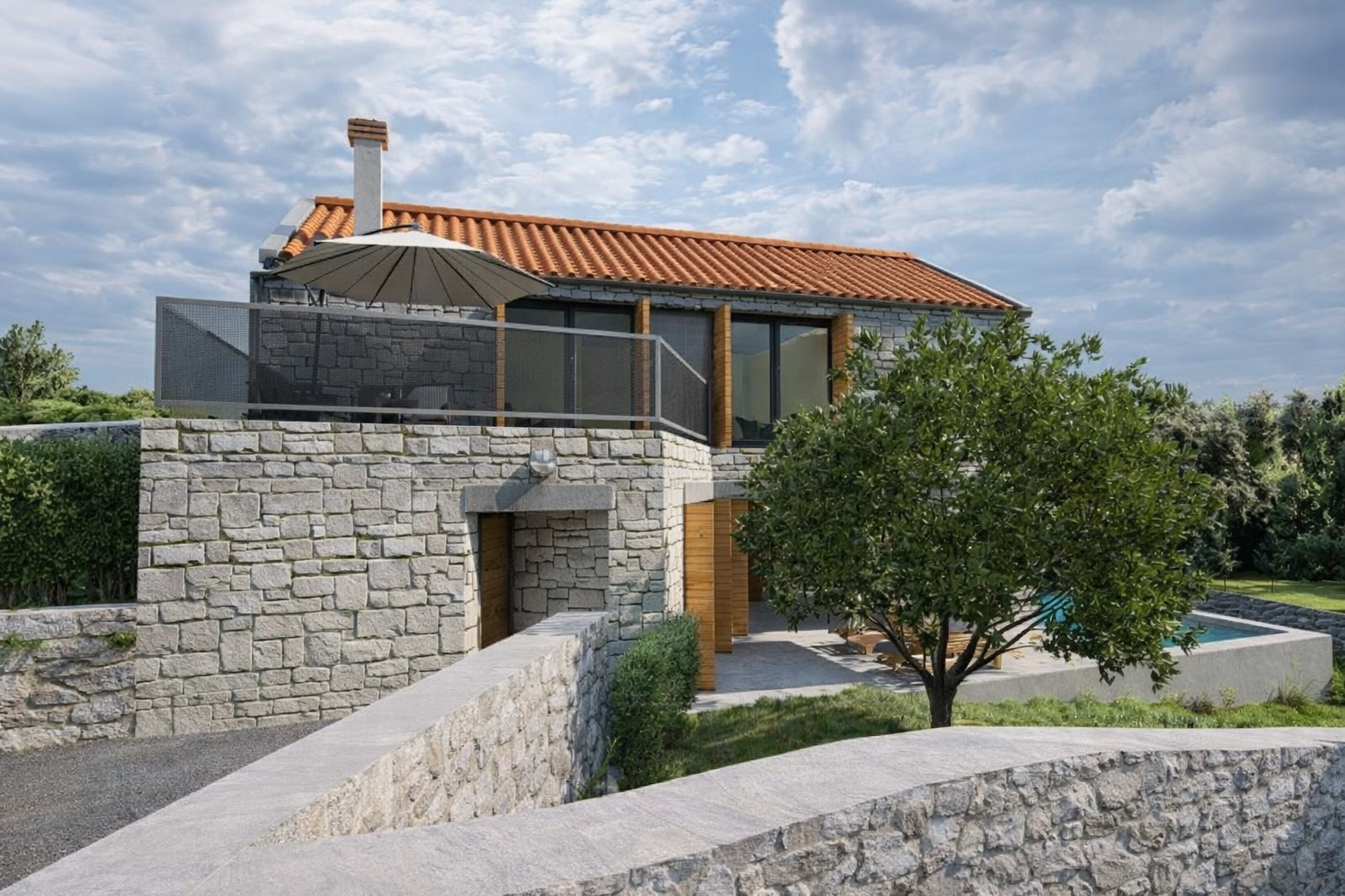 Im Obergeschoss befinden sich drei komfortable Schlafzimmer und ein weiteres Badezimmer. Die Master-Suite verfügt über ein eigenes Bad und Zugang zu einer großzügigen Terrasse mit freiem Blick über die Adria – ein Ort, der Ruhe, Privatsphäre und Lebensqualität vereint.