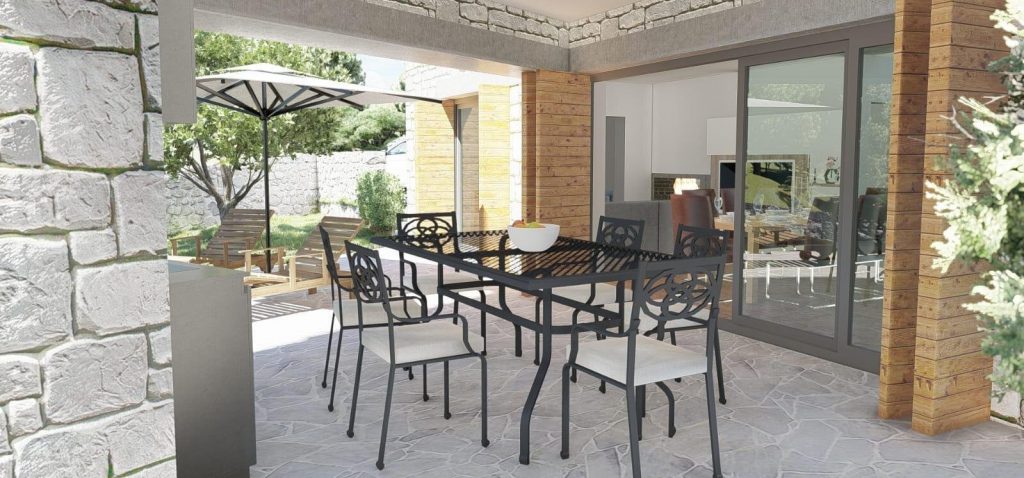 Auf einem 523 m² großen Grundstück bietet die Villa ca. 154 m² Wohnfläche und ein durchdachtes Raumkonzept mit fließenden Übergängen. Der offen gestaltete Wohn-, Ess- und Kochbereich öffnet sich zur überdachten Terrasse mit Sommerküche und führt weiter zum Infinity-Pool mit Sonnendeck – ein harmonisches Zusammenspiel aus Innenraum und mediterraner Außenwelt. Ein einladender Eingangsbereich sowie ein Gäste-WC ergänzen diese Ebene.