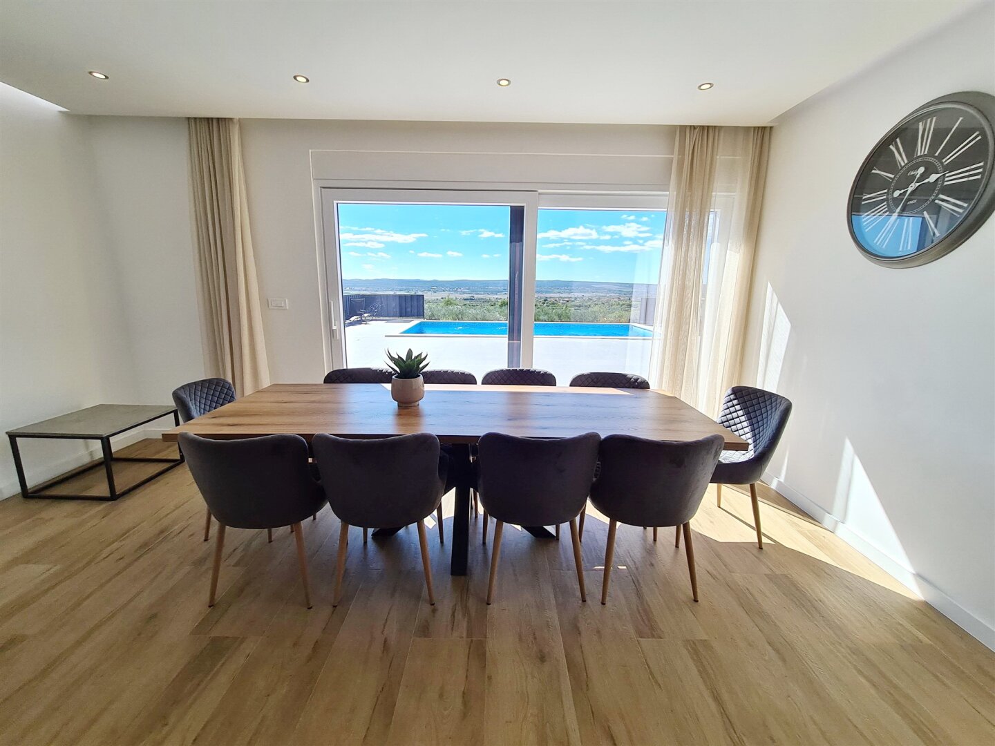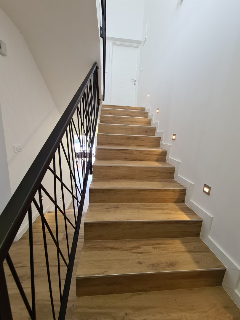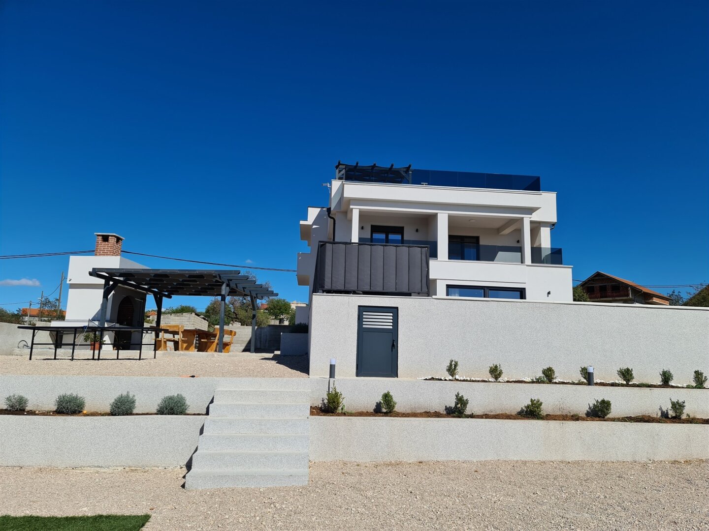 Im Obergeschoss befinden sich drei komfortable Schlafzimmer, jeweils mit eigenem Bad und Terrasse. Ein weiteres Highlight bildet die großzügige Dachterrasse mit Pergola und Jacuzzi, die einen weiten Blick über die Landschaft bis zum Velebit-Gebirge und zum Naturpark Vransko jezero eröffnet.
