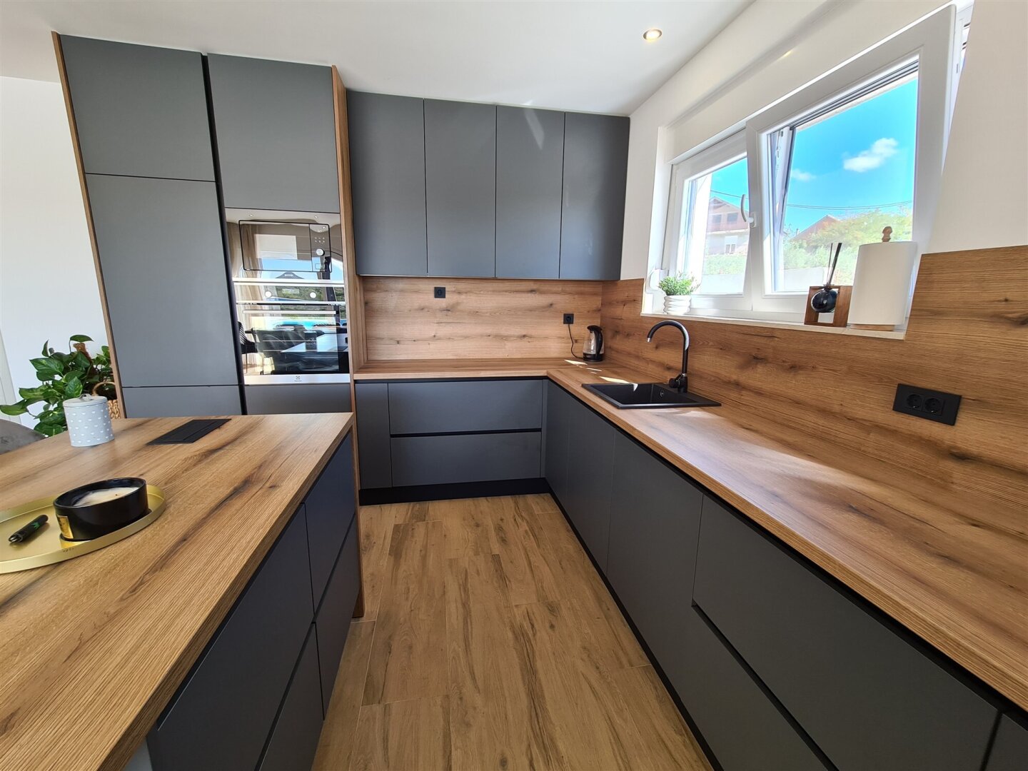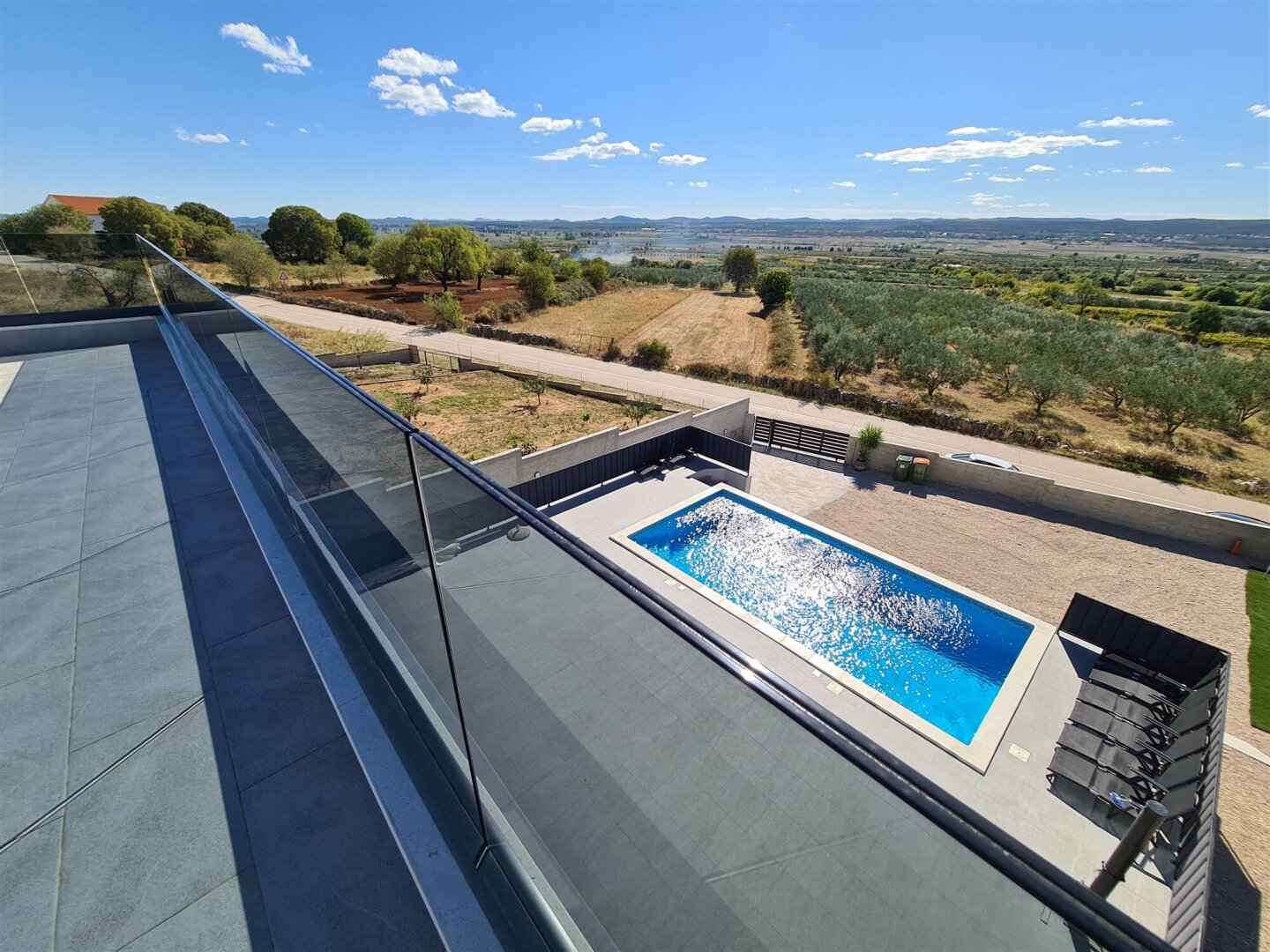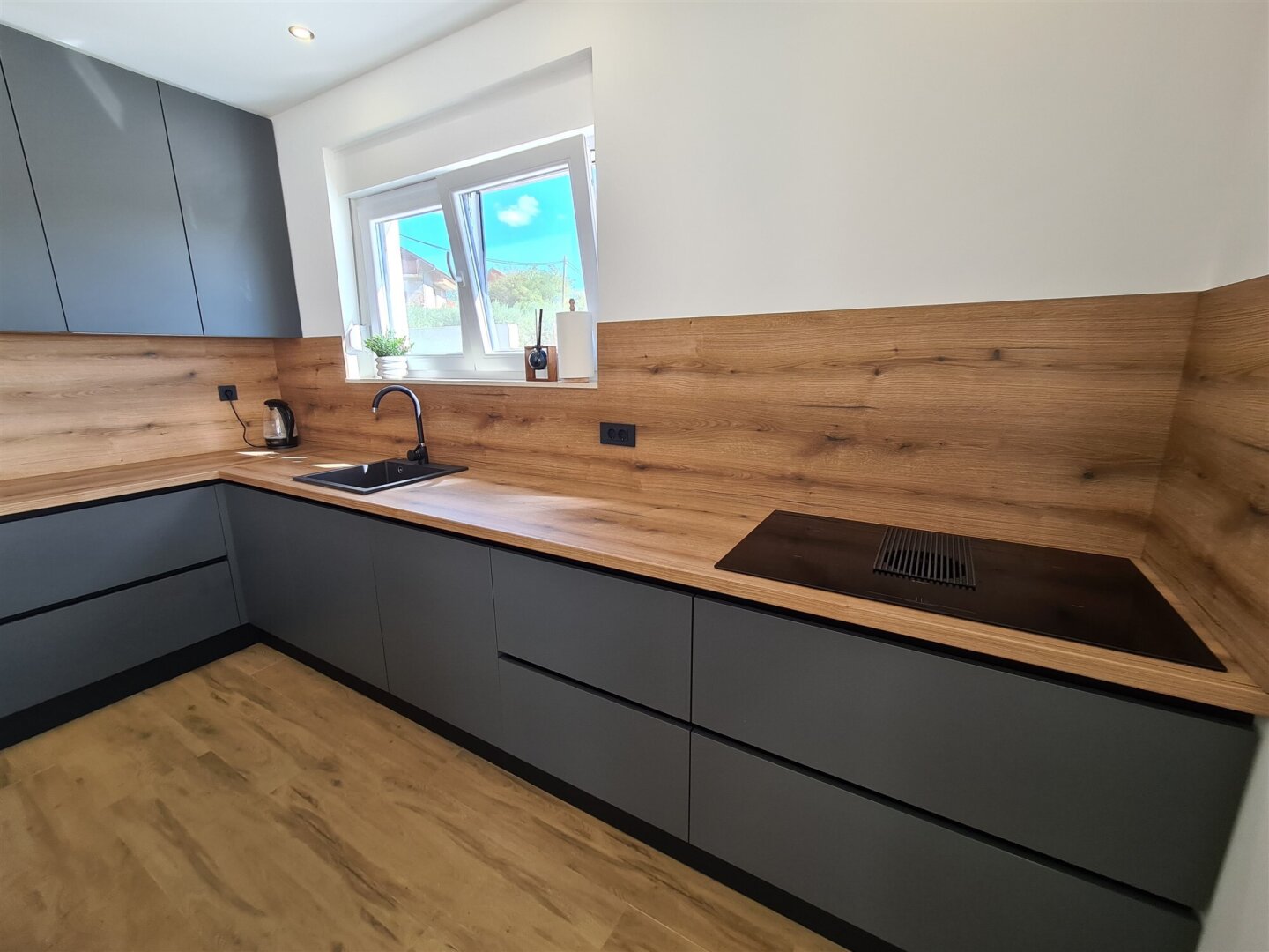 Im Obergeschoss befinden sich drei komfortable Schlafzimmer, jeweils mit eigenem Bad und Terrasse. Ein weiteres Highlight bildet die großzügige Dachterrasse mit Pergola und Jacuzzi, die einen weiten Blick über die Landschaft bis zum Velebit-Gebirge und zum Naturpark Vransko jezero eröffnet.