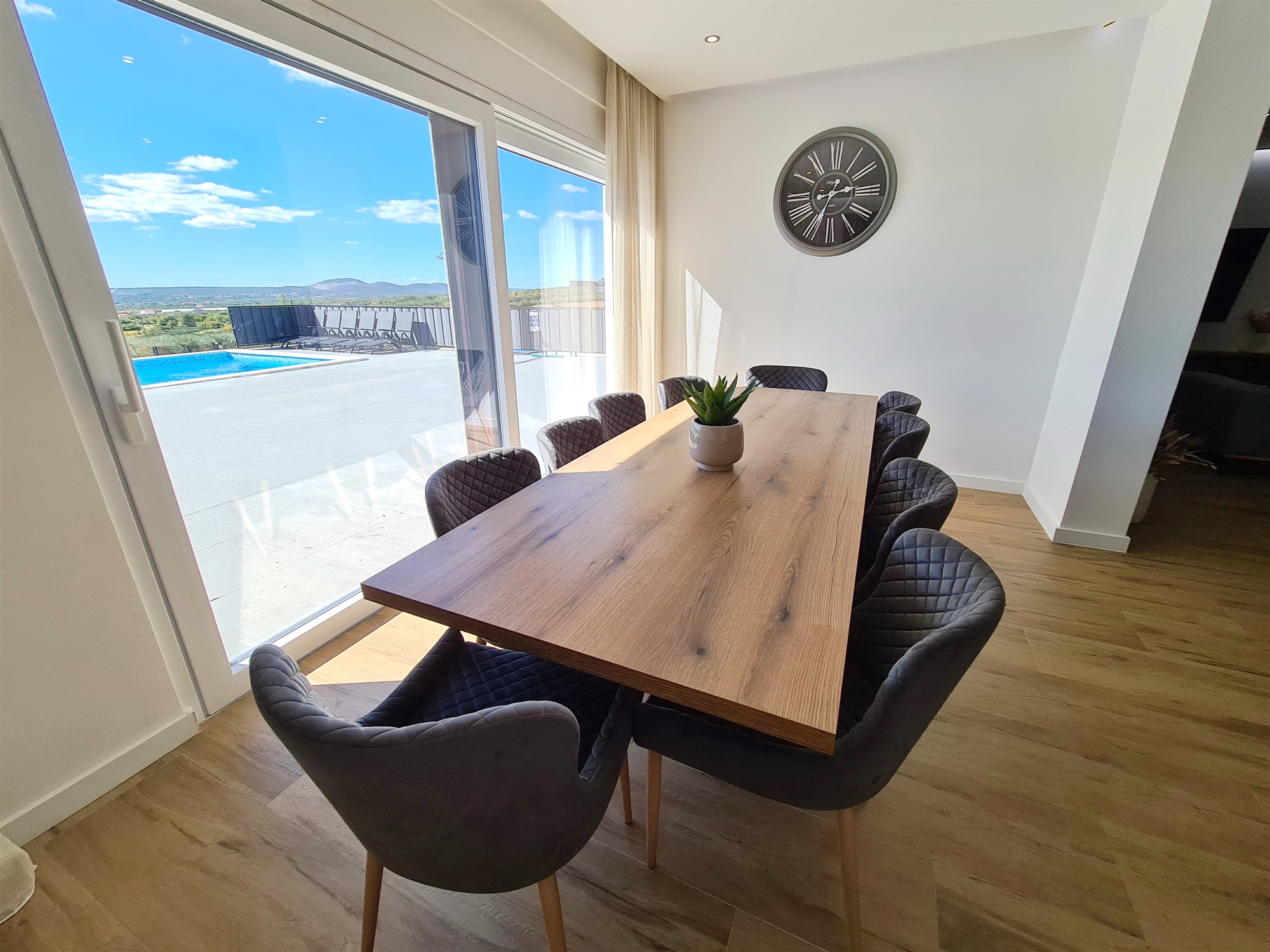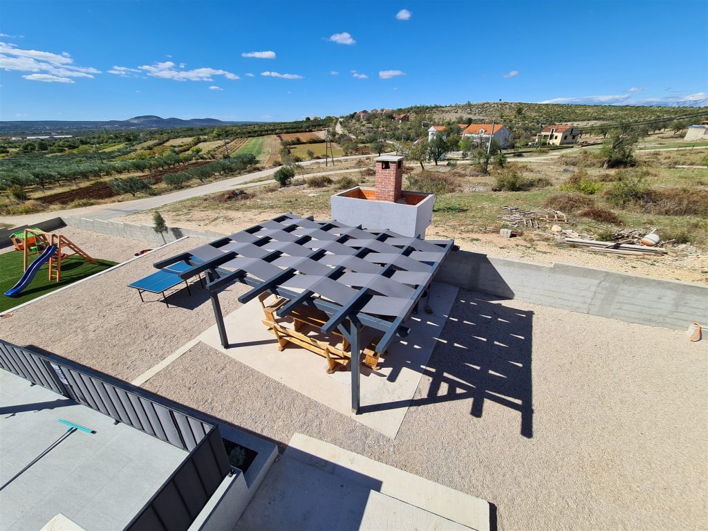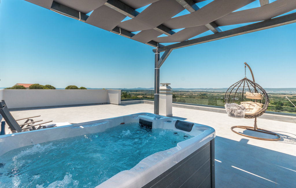 Ein besonderes Highlight ist die 60 m² große Dachterrasse mit Jacuzzi unter einer Pergola und traumhaftem Panoramablick auf das Velebit-Gebirge, den Naturpark Vransko jezero und die umliegende Landschaft.