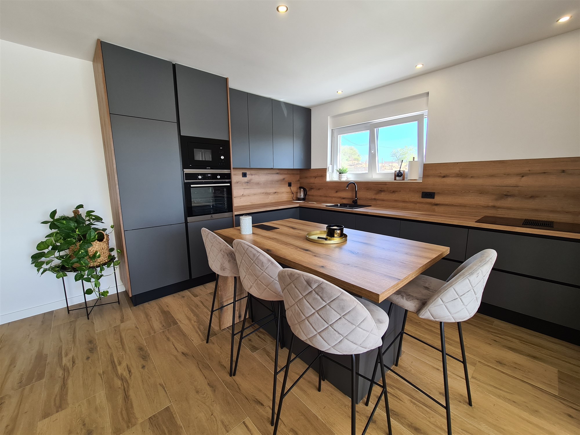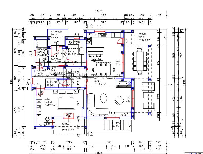 Im Erdgeschoss befinden sich ein großzügiger Wohn- und Essbereich mit offener Küche (40 m²), ein Schlafzimmer, Badezimmer, Waschküche sowie eine große Terrasse (40 m²) mit Pool, Sonnendeck und Außendusche.