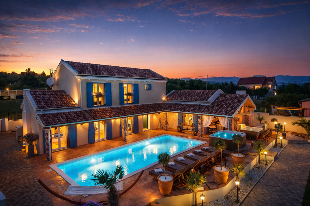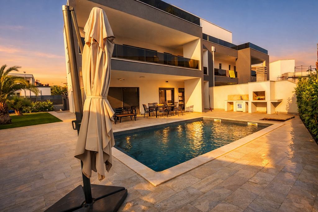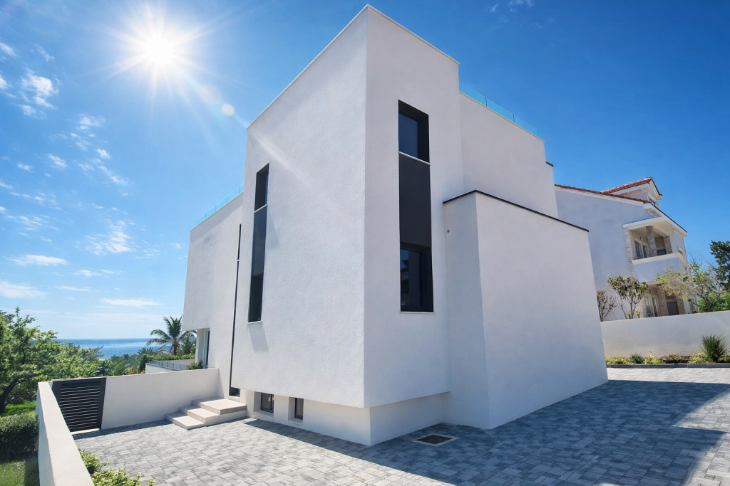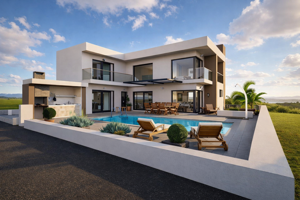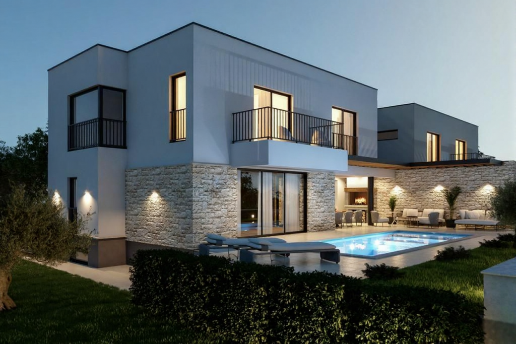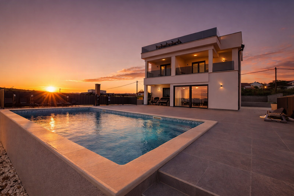 Wo moderne Architektur und mediterrane Ruhe eine vollendete Einheit bilden, entsteht eine Villa von außergewöhnlicher Qualität. Diese exklusive Residenz nahe Zadar vereint stilvolle Außenbereiche, beheizten Salzwasserpool und hochwertige Bauweise zu einem Zuhause, das Privatsphäre und Eleganz auf höchstem Niveau verkörpert.